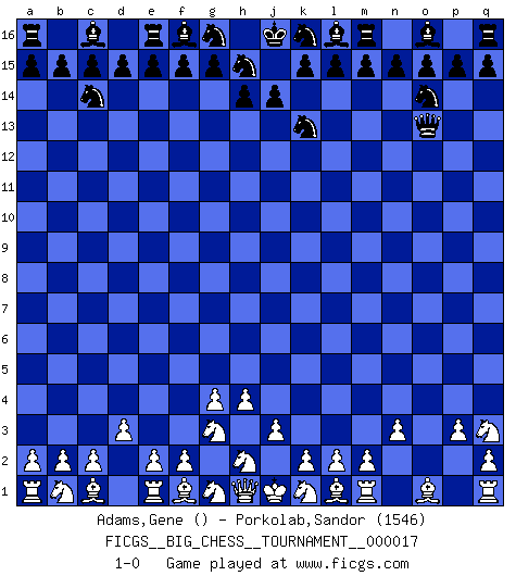 Last move : 1-0 2008 March 4 15:4:48 [Event "FICGS__BIG_CHESS__TOURNAMENT__000017"] [Site "FICGS"] [Date "2008.01.24"] [Round "1"] [White "Adams,Gene"] [Black "Porkolab,Sandor"] [Result "1-0"] [WhiteElo ""] [BlackElo "1546"] 1.g2-g4 j15-k13 2.n2-n3 h16-o10 3.h3-h4 o10-o2 4.p1-q3 o2-o13 5.d2-d3 p16-o14 6.p2-p3 b16-c14 7.j2-g3 1-0 This big chess game has been lost on time (started : 2008.01.24 7:47:27) Follow this game move after move (download)With or without the title, Bobby Fischer was unquestionably the greatest player of his time. (Burt Hochberg) Konzentriere dich auf materielle Gewinne. Nimm, was dir dein Gegner gibt, ausser es gibt einen guten Grund der dagegenspricht. (Robert James Fischer) Mis oponentes también hacen buenas movidas. A veces yo no tomo esas cosas en consideración. (Bobby Fischer) Toutes les manuvres exécutées sur une colonne ouverte ont pour but ultime l'intrusion définitive sur la septième ou la huitième rangée, en plein cur de la position ennemie. (Aaron Nimzovitch) There's no money in correspondence chess. (John Knudsen)