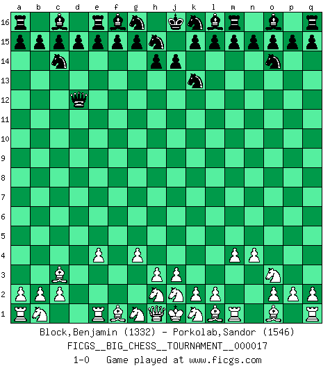 Last move : 1-0 2008 March 6 3:15:1 [Event "FICGS__BIG_CHESS__TOURNAMENT__000017"] [Site "FICGS"] [Date "2008.01.24"] [Round "1"] [White "Block,Benjamin"] [Black "Porkolab,Sandor"] [Result "1-0"] [WhiteElo "1332"] [BlackElo "1546"] 1.g2-g4 j15-k13 2.n2-n4 b16-c14 3.e2-e4 p16-o14 4.d2-d4 h16-o10 5.p1-o3 o10-f2 6.c1-d2 f2-d4 7.d2-c3 d4-d12 8.m2-m4 1-0 This big chess game has been lost on time (started : 2008.01.24 7:47:27) Follow this game move after move (download)I don't believe in psychology. I believe in good moves. (Bobby Fischer) Glücklicherweise sind Großmeister Ruben Fines reine Schachbücher weniger phallozentrisch [als seine Schachpsychologie] und deswegen auch weniger lächerlich. (Nigel Short) Si yo gano un torneo, yo lo gano por mí mismo. Yo hago las jugadas. Nadie me ayuda. (Bobby Fischer) Donnez-moi un Cavalier en 6e et je gagnerais toutes mes parties. (Steinitz) Fortune favours the audacious. (Desiderius Erasmus)