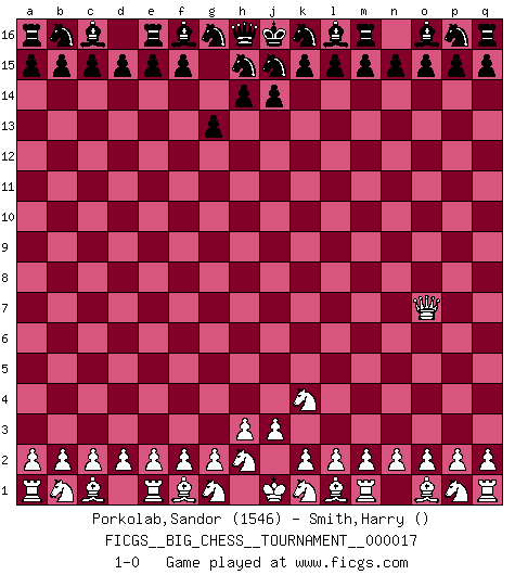 Last move : 1-0 2008 January 31 2:51:18 [Event "FICGS__BIG_CHESS__TOURNAMENT__000017"] [Site "FICGS"] [Date "2008.01.24"] [Round "1"] [White "Porkolab,Sandor"] [Black "Smith,Harry"] [Result "1-0"] [WhiteElo "1546"] [BlackElo ""] 1.j2-k4 g15-g13 2.h1-o7 1-0 Follow this game move after move (download)Bobby Fischer is the greatest Chess player who has ever lived. (Ken Smith) Ich würde mich als ganz normalen Jungen bezeichnen [Im Alter von 12]. (Sergej Karjakin) El Peón aislado arroja penumbra sobre todo el tablero. (Aaron Nimzovich) Les Echecs ont trois composantes : le temps, l'espace et le matériel en dernier. (Mikhail Tal) There's always a bigger fish. (Qui-Gon Jinn in Star Wars ep.1)
