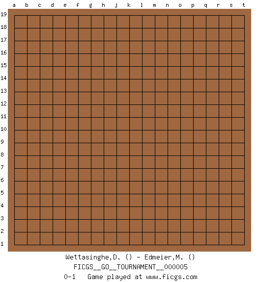 Last move : 0-1 2006 August 2 3:25:5 [Event "FICGS__GO__TOURNAMENT__000005"] [Site "FICGS"] [Date "2006.07.02"] [Round "1"] [Black "Wettasinghe,Dewaka"] [White "Edmeier,Michael"] [Result "0-1"] 0-1 This go game has been lost on time (started : 2006.07.02 17:26:59) Here are the names of the openings (joseki) played in the four corners : Player White won this Go (weiqi, baduk) game. Follow this game move after move (download)When you study joseki, you lose two stones in strength. (Anonymous) Never was anything great achieved without danger. (Niccolo Machiavelli)