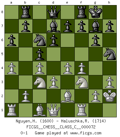 Last move : 0-1 2008 June 25 13:22:22 [Event "FICGS__CHESS__CLASS_C__000072"] [Site "FICGS"] [Date "2008.01.24"] [Round "1"] [White "Nguyen,Hao Nhien"] [Black "Haluschka,Rainer"] [Result "0-1"] [WhiteElo "1600"] [BlackElo "1714"] 1.e4 c5 2.f4 d6 3.Nf3 Nc6 4.c4 Nf6 5.d3 g6 6.Be2 Bg7 7.O-O O-O 8.Nc3 a6 9.h3 Rb8 10.a4 Nh5 11.Kh2 Bd7 0-1 Sicilian : Grand Prix attack Kingside Castling by player White (move 7) Kingside Castling by player Black (move 7) Player Black won this chess game. Follow this game move after move (download)There must have been a time when men were demigods, or they could not have invented Chess. (Gustav Schenk) Der beste Spieler in einem Turnier gewinnt es nie. Er landet auf Platz zwei oder drei. (Siegbert Tarrasch) Coloca el contenido de las piezas del Ajedrez en un sombrero, agitalo vigorosamente, arrojalas en un tablero desde una altura de 30 centimetros y así obtendras el estilo de Steinitz. (H. E. Bird) Que feriez-vous si vous étiez en train de jouer aux échecs et que la fin du monde arrive ? Je continuerais à jouer. (Saint Borromée) Follow your passion, and success will follow you. (Arthur Buddhold)