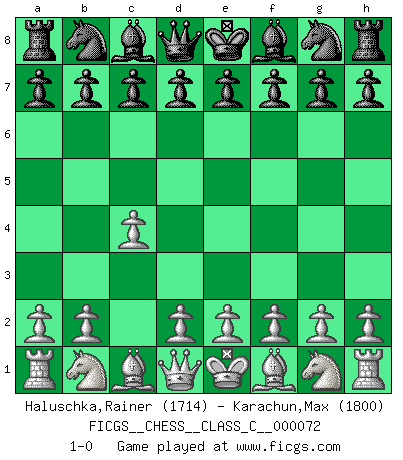 Last move : 1-0 2008 March 15 4:20:18 [Event "FICGS__CHESS__CLASS_C__000072"] [Site "FICGS"] [Date "2008.01.24"] [Round "1"] [White "Haluschka,Rainer"] [Black "Karachun,Max"] [Result "1-0"] [WhiteElo "1714"] [BlackElo "1800"] 1.c4 1-0 This chess game has been lost on time (started : 2008.01.24 19:1:59) English Opening Player White won this chess game. Follow this game move after move (download)In a gambit you give up a Pawn for the sake of getting a lost game. (Samuel Standige Boden) Kritik überlasse ich den Spießern. Ich zeige nichts, wofür ich mich schämen muss. (Alexandra Kosteniuk) Para mi, el Ajedrez es la vida y cada partida es como una nueva vida. Todo jugador de Ajedrez suele vivir muchas vidas durante su vida. (Eduard Gufeld) Aux échecs, les retours au sommet sont rares : les dommages psychologiques consécutifs à une défaite sont trop sévères. (Daily Telegraph) Work expands to fill the time available. (C. Northcote Parkinson, in Parkinson's Laws)