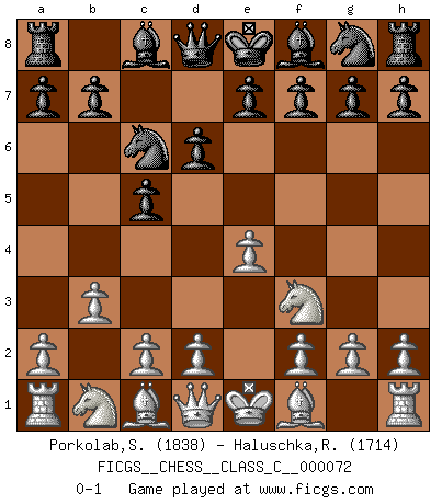Last move : 0-1 2008 March 16 4:23:50 [Event "FICGS__CHESS__CLASS_C__000072"] [Site "FICGS"] [Date "2008.01.24"] [Round "1"] [White "Porkolab,Sandor"] [Black "Haluschka,Rainer"] [Result "0-1"] [WhiteElo "1838"] [BlackElo "1714"] 1.e4 c5 2.Nf3 Nc6 3.b3 d6 0-1 This chess game has been lost on time (started : 2008.01.24 19:1:59) Sicilian defense Player Black won this chess game. Follow this game move after move (download)Some part of a mistake is always correct. (Savielly Tartakover) Die Fehler sind da, Sie warten nur darauf gemacht zu werden. (Savielly Grigorievitsch Tartakower) La vida es como un juego de Ajedrez, cambiando con cada movimiento. (Proverbio Chino) RxDa4 pat (...) The age of a woman doesn't mean a thing. The best tunes are played on the oldest fiddles. (Ralph Waldo Emerson)