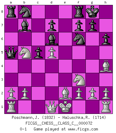Last move : 0-1 2008 June 10 23:58:27 [Event "FICGS__CHESS__CLASS_C__000072"] [Site "FICGS"] [Date "2008.01.24"] [Round "1"] [White "Poschmann,Jeremie"] [Black "Haluschka,Rainer"] [Result "0-1"] [WhiteElo "1832"] [BlackElo "1714"] 1.d4 Nf6 2.c4 c5 3.d5 b5 4.cxb5 Bb7 5.Nc3 e6 6.e4 exd5 7.exd5 Bd6 8.Bg5 O-O 9.Nf3 h6 10.Bh4 a6 11.Be2 axb5 12.Nxb5 Qa5+ 0-1 Benko gambit Kingside Castling by player Black (move 8) Player Black won this chess game. Follow this game move after move (download)If cunning alone were needed to excel, women would be the best Chess players. (Albin) Es gibt nur zwei wahre Schachgenies - das andere war Wilhelm Steinitz, der Weltmeister von 1872 bis 1894. (Robert James Fischer) Puntos débiles o agujeros en la posición de tu oponente deben de ser ocupados por piezas, no Peones. (Siegbert Tarrasch) Assurément je connaissais par expérience le mystérieux attrait de ce jeu royal, le seul entre tous les jeux inventés par les hommes qui échappe souverainement à la tyrannie du hasard, le seul où l'on ne doive sa victoire qu'à son intelligence ou plutôt à une certaine forme d'intelligence. Mais n'est-ce pas déjà le limiter injurieusement que d'appeler les échecs un jeu ? N'est-ce pas une science, un art ou quelque chose qui, comme le cercueil de Mahomet entre ciel et terre, est suspendu entre l'un et l'autre, et qui réunit un nombre incroyable de contraires ? [...] C'est une pensée qui ne mène à rien, une mathématique qui n'établit rien, un art qui ne laisse pas d'uvre, une architecture sans matière; et il l'a prouvé néanmoins qu'il était plus durable, à sa manière, que les livres ou que tout autre monument, ce jeu unique qui appartient à tous les peuples et à tous les temps, et dont personne ne sait quel dieu en fit don à la terre pour tuer l'ennui, pour aiguiser l'esprit et stimuler l'âme. Où commence-t-il, où finit-il ? (Stefan Zweig) You can think I'm wrong, but that's no reason to quit thinking. (Gregory House, House M.D.)
