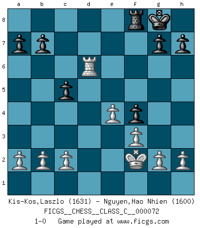Last move : 1-0 2008 June 5 23:41:59 [Event "FICGS__CHESS__CLASS_C__000072"] [Site "FICGS"] [Date "2008.01.24"] [Round "1"] [White "Kis-Kos,Laszlo"] [Black "Nguyen,Hao Nhien"] [Result "1-0"] [WhiteElo "1631"] [BlackElo "1600"] 1.e4 e5 2.Nf3 Nc6 3.Bb5 Nf6 4.O-O d6 5.d4 Bd7 6.Nc3 Nxd4 7.Nxd4 exd4 8.Qxd4 Be7 9.Bc4 O-O 10.f3 Be6 11.Bxe6 fxe6 12.Be3 e5 13.Qc4+ Kh8 14.Rad1 Qd7 15.Rd3 Nh5 16.Nd5 c6 17.Nxe7 Qxe7 18.Rfd1 Rad8 19.Qb4 c5 20.Qd2 Nf4 21.Bxf4 exf4 22.Rxd6 Rxd6 23.Qxd6 Qxd6 24.Rxd6 Kg8 25.Kf2 1-0 Ruy Lopez : Berlin defense, 4.O-O, d6 Kingside Castling by player White (move 4) Kingside Castling by player Black (move 9) Player White won this chess game. Follow this game move after move (download)During a Chess competition a Chessmaster should be a combination of a beast of prey and a monk. (Alexander Alekhine) Ich habe kein Problem mit Frauen, sondern nur mit dem Niveau ihres Schachspiels (Judith Polgar) El Ajedrez es de 30 a 40 por ciento psicología. Uno no cuenta con esto cuando se juega contra una computadora. No lo puedo confundir. (Judith Polgar) Le profane ne songe pas à la somme de jouissance dont il se prive, qui méconnaît ce jeu aux ressources aussi variées que passionnantes. (Jean-Marie Jeanton-Lamarche) Hold em is to stud what chess is to checkers. (Johnny Moss)