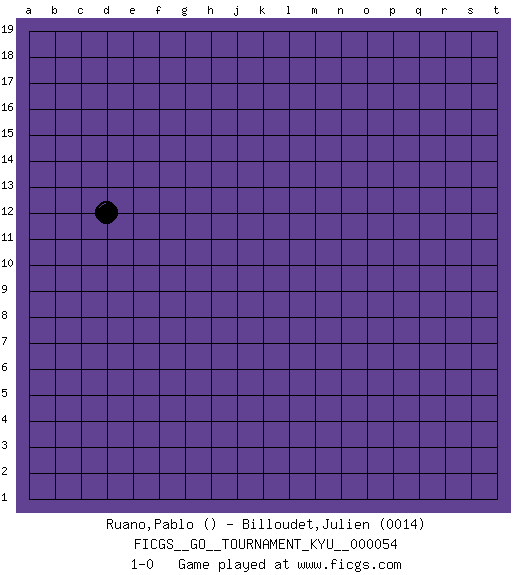 Last move : 1-0 2008 February 26 2:38:28 [Event "FICGS__GO__TOURNAMENT_KYU__000054"] [Site "FICGS"] [Date "2008.01.26"] [Round "1"] [Black "Ruano,Pablo"] [White "Billoudet,Julien"] [Result "1-0"] [Rating 2 "0014"] 1.d12 1-0 This go game has been lost on time (started : 2008.01.26 7:20:15) Here are the names of the openings (joseki) played in the four corners : Player Black won this Go (weiqi, baduk) game. Follow this game move after move (download)Add one stone, then sacrifice both. (Anonymous) Life is like internet, nothing interesting, but noone want to leave it. (Ilmars Cirulis)