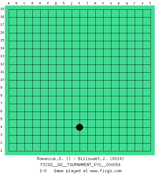 Last move : 1-0 2008 February 25 14:38:16 [Event "FICGS__GO__TOURNAMENT_KYU__000054"] [Site "FICGS"] [Date "2008.01.26"] [Round "1"] [Black "Romaniuk,Dmytro"] [White "Billoudet,Julien"] [Result "1-0"] [Rating 2 "0014"] 1.k4 1-0 This go game has been lost on time (started : 2008.01.26 7:20:15) Here are the names of the openings (joseki) played in the four corners : Player Black won this Go (weiqi, baduk) game. Follow this game move after move (download)Eyes win semiais. (Anonymous) History is a gallery of pictures in which there are few originals and many copies. (Alexis de Tocqueville)