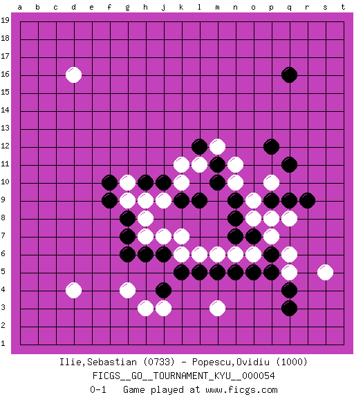 Last move : 0-1 2008 May 6 21:18:5 [Event "FICGS__GO__TOURNAMENT_KYU__000054"] [Site "FICGS"] [Date "2008.01.26"] [Round "1"] [Black "Ilie,Sebastian"] [White "Popescu,Ovidiu"] [Result "0-1"] [Rating 1 "0733"] [Rating 2 "1000"] 1.q16 d4 2.q3 d16 3.r9 q5 4.q4 s5 5.p5 q6 6.p6 q8 7.q9 p7 8.o7 o8 9.n7 m3 10.p9 p8 11.n8 o9 12.p12 o6 13.o5 n6 14.n5 m6 15.m5 l6 16.l5 k6 17.k5 j3 18.j6 k7 19.n9 n10 20.l9 p10 21.q11 j7 22.h6 h7 23.g6 g4 24.j4 h3 25.g7 h9 26.g8 h8 27.f10 k11 28.m10 n11 29.m11 m12 30.j10 k10 31.k9 j9 32.h10 g9 33.f9 g10 34.l12 l11 0-1 This go game has been lost on time (started : 2008.01.26 7:20:15) Here are the names of the openings (joseki) played in the four corners : Player White won this Go (weiqi, baduk) game. Follow this game move after move (download)Fighting must not be the key to go, it should be reserved as your last resource. (Zhong-Pu Liu, about Weiqi) Success without honor is an unseasoned dish; it will satisfy your hunger, but it won't taste good. (Joe Paterno)
