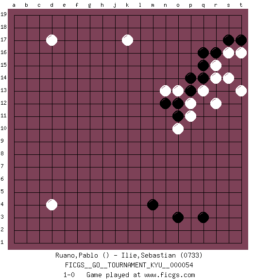 Last move : 1-0 2008 April 23 8:24:30 [Event "FICGS__GO__TOURNAMENT_KYU__000054"] [Site "FICGS"] [Date "2008.01.26"] [Round "1"] [Black "Ruano,Pablo"] [White "Ilie,Sebastian"] [Result "1-0"] [Rating 2 "0733"] 1.q16 d17 2.q3 d4 3.o3 r14 4.q14 r15 5.r16 q13 6.q15 r12 7.m4 k17 8.p13 p12 9.o12 p11 10.s15 s14 11.t14 s16 12.t15 t13 13.s17 t16 14.o11 o13 15.p14 n13 16.t17 o10 17.n12 1-0 This go game has been lost on time (started : 2008.01.26 7:20:15) Here are the names of the openings (joseki) played in the four corners : Corner q16 : q16 r14 Hoshi (Hwajeom, Seongjeom, Xingwei`) 4-4 Point. The star or hoshi (4-4) point, emphasizing influence at the potential expense of territory. Ikken Kakari (Hankan Keolch'im, Yi Gua`jiao~, 1-Space Low Approach). White 2 is the standard approach move to the 4-4. Player Black won this Go (weiqi, baduk) game. Follow this game move after move (download)Connect with good shape. (Anonymous) Chess is everything: art, science and sport. (Anatoly Karpov)