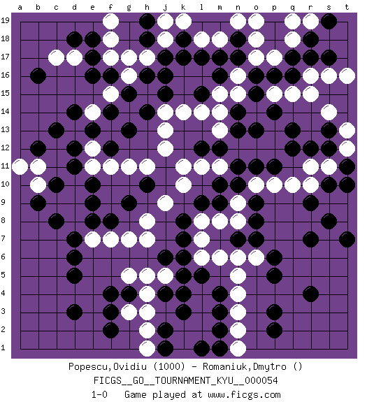 Last move : 1-0 2008 September 25 7:10:0 [Event "FICGS__GO__TOURNAMENT_KYU__000054"] [Site "FICGS"] [Date "2008.01.26"] [Round "1"] [Black "Popescu,Ovidiu"] [White "Romaniuk,Dmytro"] [Result "1-0"] [Rating 1 "1000"] 1.e16 r15 2.q17 q15 3.o16 e7 4.d3 p17 5.p16 o17 6.n17 q18 7.q16 n16 8.n18 o18 9.r18 o19 10.m16 n15 11.l17 s16 12.s17 r16 13.r17 n19 14.o15 m15 15.l15 m14 16.o13 l14 17.q12 j14 18.j16 k14 19.s13 t16 20.d5 m18 21.m17 l18 22.k17 j18 23.k18 k19 24.h18 h17 25.j17 j19 26.h16 g17 27.h19 g16 28.d14 h15 29.r4 f11 30.d11 k10 31.e9 e11 32.d12 f17 33.g13 g11 34.h14 h11 35.g15 j13 36.j15 f15 37.f16 e12 38.e13 f13 39.f14 j12 40.d7 e14 41.f12 d13 42.c13 d10 43.e8 d8 44.e10 d9 45.d6 f7 46.c8 c9 47.b9 q10 48.r7 t9 49.s8 t8 50.t7 s9 51.r9 r10 52.s10 r11 53.r12 s11 54.t10 t13 55.s12 t12 56.t11 p10 57.k4 o10 58.f8 g7 59.g4 h8 60.k7 s14 61.m10 k11 62.n11 j9 63.m9 m11 64.m12 l11 65.n10 n12 66.n13 m13 67.l12 d17 68.e17 f18 69.e18 f19 70.d18 c17 71.b16 o12 72.o11 p12 73.p11 p13 74.p14 o14 75.q13 p15 76.n14 n5 77.p3 n4 78.o7 n8 79.n7 m8 80.l9 l8 81.k8 l7 82.k6 l6 83.l5 m6 84.m3 n3 85.m2 n2 86.p2 n1 87.p5 l4 88.m4 l3 89.k3 j5 90.k5 l2 91.l1 k2 92.j2 k1 93.j1 n6 94.o8 n9 95.o9 g5 96.f4 h4 97.j4 h3 98.j6 h5 99.g9 h2 100.f2 h1 101.m1 b10 102.c10 b11 103.b12 a11 104.pass r19 105.s19 q19 106.pass g3 107.f3 o6 108.p6 pass 109.pass pass 110.pass h7 111.h10 1-0 Comment by player 1 : Ovidiu Popescu : none of your group can survive. you have to resign to end this game.do it please. thank you for the game! Here are the names of the openings (joseki) played in the four corners : Corner q16 : r15 q17 Mokuhazushi (Waemok, Wai`mu`) 5-3 Point. The mokuhazushi (5-3) point was popular in the Edo period in Japan (1600 - 1867). It emphasizes influence; territorially, it is inferior to the 3-4 point. Komoku Kakari. Black 2 is the standard approach because of its solidity and stability. Corner d4 : e7 d3 This joseki is unknown. A weak or weird move has probably been played in this corner. Corner d16 : e16 j14 Takamoku (Gomok, Gaomu`) 5-4 Point. The takamoku (high) point (5-4). With its emphasis on influence, the 5-4 point complements the 4-4 (hoshi) point in creating an influence-oriented fuseki. Player Black won this Go (weiqi, baduk) game. Follow this game move after move (download)The strong player plays straight, the weak diagonally. (Anonymous) Convictions are more dangerous enemies of truth than lies. (Friedrich Nietzsche)