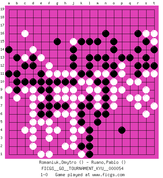 Last move : 1-0 2008 October 11 11:17:35 [Event "FICGS__GO__TOURNAMENT_KYU__000054"] [Site "FICGS"] [Date "2008.01.26"] [Round "1"] [Black "Romaniuk,Dmytro"] [White "Ruano,Pablo"] [Result "1-0"] 1.d10 c4 2.g10 c16 3.e9 c13 4.f6 f4 5.e6 f5 6.g5 d6 7.e4 e5 8.e3 f3 9.f2 d3 10.e2 g6 11.g7 h6 12.h5 f7 13.e7 e8 14.f8 d8 15.h7 j6 16.k7 d7 17.f7 d5 18.k5 j5 19.h4 j4 20.h3 g4 21.g2 h2 22.h1 j2 23.g3 j3 24.j1 j7 25.k2 k4 26.l4 l6 27.k6 j8 28.k9 k8 29.l8 j9 30.j10 g8 31.f9 l9 32.l7 k10 33.m6 l5 34.m5 d2 35.h10 d4 36.l3 h8 37.m10 m8 38.n8 e1 39.k11 m7 40.n7 m9 41.n9 l10 42.l11 m11 43.n10 n11 44.o11 f1 45.g1 k1 46.l2 o10 47.m13 o9 48.n12 o8 49.l12 o7 50.n6 p11 51.o12 p12 52.p4 j11 53.r9 f12 54.r12 r10 55.s10 s11 56.r11 q10 57.q13 s9 58.t10 r8 59.t9 s8 60.t8 t7 61.p13 r13 62.q9 q8 63.s7 t11 64.s12 p9 65.s13 s14 66.r14 s6 67.t14 t15 68.s15 r7 69.l1 k12 70.l13 h11 71.d13 g11 72.j12 k13 73.j13 k14 74.j14 j15 75.k15 l14 76.l15 m14 77.m15 n14 78.o15 s16 79.r16 t16 80.o14 n15 81.n16 g9 82.f10 d9 83.c10 f11 84.g15 d11 85.c12 c11 86.b11 b12 87.d12 e13 88.e11 d14 89.a11 a12 90.n13 c9 91.b9 b8 92.b13 h9 93.e10 a9 94.b10 a13 95.a14 t13 96.t12 1-0 This go game has been lost on time (started : 2008.01.26 7:20:15) Here are the names of the openings (joseki) played in the four corners : Corner d4 : c4 e9 Komoku (Somok, Xiao~mu`) 3-4 Point. The komoku (3-4) point is the traditional corner enclosure move.. Corner q4 : l4 l6 This joseki is unknown. A weak or weird move has probably been played in this corner. Corner q16 : l11 m11 This joseki is unknown. A weak or weird move has probably been played in this corner. Player Black won this Go (weiqi, baduk) game. Follow this game move after move (download)The simplest move is the best move. (Anonymous) The absolute truth is the thing that makes people laugh. (Carl Reiner)