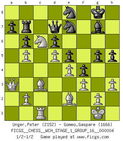 Last move : 1/2-1/2 2008 March 10 10:11:38 [Event "FICGS__CHESS__WCH_STAGE_1_GROUP_16__000004"] [Site "FICGS"] [Date "2008.01.27"] [Round "1"] [White "Unger,Peter"] [Black "Gommo,Gaspare"] [Result "1/2-1/2"] [WhiteElo "2152"] [BlackElo "1666"] 1.d4 Nf6 2.Nf3 g6 3.c4 Bg7 4.Nc3 O-O 5.e4 d6 6.Be2 e5 7.O-O Nc6 8.d5 Ne7 9.Ne1 Nd7 10.Nd3 f5 11.Bd2 Nf6 12.f3 f4 13.c5 g5 14.cxd6 cxd6 15.Nf2 Bd7 16.a4 h5 17.Nb5 Bxb5 18.axb5 Ng6 19.Qc2 Qd7 20.h3 Rfc8 21.Qb3 Ne8 22.Ra4 b6 23.Rfa1 Rc7 24.Bc3 Nh4 25.Nd3 Ng6 26.Rc4 Rxc4 27.Qxc4 Rb8 28.Nb4 Ne7 29.Qb3 Rb7 30.Nc6 Nc8 31.Rc1 Ne7 32.Qa3 1/2-1/2 King's Indian : East Indian defense Kingside Castling by player Black (move 4) Kingside Castling by player White (move 7) This chess game ended in a draw. Follow this game move after move (download)Though most people love to look at the games of the great attacking masters, some of the most successful players in history have been the quiet positional players. They slowly grind you down by taking away your space, tying up your pieces, and leaving you with virtually nothing to do ! (Yasser Seirawan) Kein Schachspieler kann gut schlafen. (H. G. Wells) Un Peón pasado aumenta su poder a medida de que el número de piezas en el tablero disminuye. (Capablanca) Aux échecs, l'amour-propre est satisfait quand on remporte la victoire, mais il n'y a pas de honte à être battu. (Benjamin Franklin) A married woman is like a fish riding a bicycle. (Rodolfo d'Ettorre)