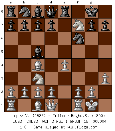 Last move : 1-0 2008 February 17 1:38:47 [Event "FICGS__CHESS__WCH_STAGE_1_GROUP_16__000004"] [Site "FICGS"] [Date "2008.01.27"] [Round "1"] [White "Lopez,Victor"] [Black "Tellore Raghu,Shyam Sundar"] [Result "1-0"] [WhiteElo "1632"] [BlackElo "1800"] 1.e4 e5 2.Bc4 Bc5 3.Nc3 Nf6 4.Nf3 Ng4 5.O-O O-O 6.h3 Nf6 7.Nxe5 Re8 8.Nxf7 1-0 Bishop's Opening : Classical variation Kingside Castling by player White (move 5) Kingside Castling by player Black (move 5) Player White won this chess game. Follow this game move after move (download)No one ever won a game by resigning. (Unknown) Offensichtlich kennt Kasparow nichts anderes als Schach, und ich könnte 500 weitere Spieler dieser Sorte benennen. (Judith Polgar) Con o sin el título, Bobby Fischer fue sin lugar a dudas el mas grande jugador de su época. (Burt Hochberg) Ce qui caractérise les parties de combat, c'est que si le défenseur a constamment de difficiles problèmes à résoudre, l'attaquant doit chercher sans relâche de nouvelles possibilités d'attaque. (Koblentz) The large trees attract high winds. (Chinese proverb)