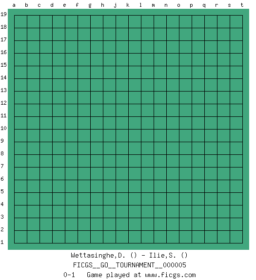 Last move : 0-1 2006 August 2 3:25:5 [Event "FICGS__GO__TOURNAMENT__000005"] [Site "FICGS"] [Date "2006.07.02"] [Round "1"] [Black "Wettasinghe,Dewaka"] [White "Ilie,Sebastian"] [Result "0-1"] 0-1 This go game has been lost on time (started : 2006.07.02 17:26:59) Here are the names of the openings (joseki) played in the four corners : Player White won this Go (weiqi, baduk) game. Follow this game move after move (download)Learning josekis by heart is useless if you don't try departing from them. (Pierre Audouard) You know what they say : You lie down with the Devil, you wake up in Hell. (Horatio Caine, C.S.I. Miami)