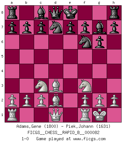 Last move : 1-0 2008 April 9 19:16:55 [Event "FICGS__CHESS__RAPID_B__000082"] [Site "FICGS"] [Date "2008.01.27"] [Round "1"] [White "Adams,Gene"] [Black "Piek,Johann"] [Result "1-0"] [WhiteElo "1800"] [BlackElo "1631"] 1.e4 Nf6 2.Nc3 d5 3.d3 dxe4 4.Bg5 exd3 5.Bxd3 Nbd7 6.Nf3 g6 7.O-O Bg7 8.Bd2 1-0 This chess game has been lost on time (started : 2008.01.27 18:27:8) Alekhine's defense : Scandinavian variation Kingside Castling by player White (move 7) Player White won this chess game. Follow this game move after move (download)When you don't know what to do, wait for your opponent to get an idea - it's sure to be wrong. (Tarrasch) Es ist peinlich, dass ich nie Weltmeister wurde. Es wäre leicht, Leonid Breschnjew als Ursache vorzuschieben, dessen Apparat den Vorzeigekommunisten Anatoli Karpow in allem unterstützte. Aber Garri Kasparow zum Beispiel, der ebenfalls von den Sowjets unerwünscht war, hat trotz der Widerstände den WM-Titel erobert. (Viktor Kortschnoi) Ciertamente el estado mental actual de Bobby Fischer es una tragedia. Uno de los mas grandes jugadores de Ajedrez del mundo -el orgullo y pena del Ajedrez Americano. (Frank Brady) Un millionnaire : 'Monsieur Steinitz ! Vous ne participez aux tournois que pour l'argent, alors que moi je n'y viens que pour l'honneur.' Steinitz : 'Chacun joue pour ce qu'il n'a pas'... I've never seen so many men wasted so badly. (Blondie in The Good, The Bad and The Ugly)