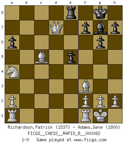 Last move : 1-0 2008 March 6 8:37:16 [Event "FICGS__CHESS__RAPID_B__000082"] [Site "FICGS"] [Date "2008.01.27"] [Round "1"] [White "Richardson,Patrick"] [Black "Adams,Gene"] [Result "1-0"] [WhiteElo "1537"] [BlackElo "1800"] 1.d4 g6 2.c4 Bg7 3.Nc3 Nf6 4.e4 d6 5.Nf3 O-O 6.Be2 c5 7.O-O cxd4 8.Nxd4 e5 9.Ndb5 a6 10.Nxd6 Nc6 11.c5 Ra7 12.Be3 Nd7 13.Bg4 b6 14.Nxc8 Qxc8 15.cxb6 Qb7 16.bxa7 Nxa7 17.Qxd7 Qxb2 18.Na4 Qb4 19.Bxa7 Qxe4 20.Bc5 Ra8 21.Bf3 Qf5 22.Qxf5 Re8 23.Qd7 1-0 Modern defense Kingside Castling by player Black (move 5) Kingside Castling by player White (move 7) Player White won this chess game. Follow this game move after move (download)A win by an unsound combination, however showy, fills me with artistic horror. (Wilhelm Steinitz) Wenn Dein Gegner dir ein Remis anbietet, versuch herauszufinden, weshalb er glaubt schlechter zu stehen. (Nigel Short) El Ajedrez es tan inspirador que yo no creo que un buen jugador sea capaz de tener un pensamiento malo durante una partida. (Wilhelm Steinitz) Le joueur d'Echecs qui veut atteindre le top est obligé de développer son propre credo créatif. Alexeï Stepanovicth Souétine. Il est facile d'écrire des livres ! Ce qui est difficile, c'est de jouer ! (Alexeï Stepanovicth Souétine) A government big enough to give you everything you want is strong enough to take everything you have. (Thomas Jefferson)