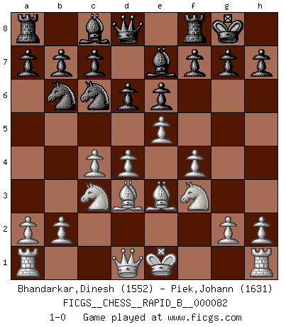 Last move : 1-0 2008 March 31 6:39:11 [Event "FICGS__CHESS__RAPID_B__000082"] [Site "FICGS"] [Date "2008.01.27"] [Round "1"] [White "Bhandarkar,Dinesh"] [Black "Piek,Johann"] [Result "1-0"] [WhiteElo "1552"] [BlackElo "1631"] 1.e4 Nf6 2.e5 Nd5 3.d4 d6 4.c4 Nb6 5.f4 e6 6.Nf3 Be7 7.Nc3 O-O 8.Bd3 Nc6 9.Be3 1-0 This chess game has been lost on time (started : 2008.01.27 18:27:8) Alekhine's defense : Four pawns attack Kingside Castling by player Black (move 7) Player White won this chess game. Follow this game move after move (download)The most powerful weapon in Chess is to have the next move. (David Bronstein) Ja, ich habe einmal eine Blitzpartie gespielt, es war in einem Zug, 1929. --im Interview 1989 (Mikhail Moiseyevich Botvinik) Una compensación adecuada por un sacrificio es tener una combinación sólida que conduce a una posición ganadora; una compensación adecuada por una metida de pata es dejar a tu oponente arrebatar una derrota de las fauces de la victoria. (Bruce A. Moon) Echiquier : carré parfait, comme la Jérusalem nouvelle décrite par l'auteur de l'Apocalypse, huit cases sur huit, exaltation du chiffre 4, symbole du cosmos aux quatre horizons... où le noir et le blanc, l'ombre et la lumière, le mal et le bien s'entremêlent et se conjuguent. (Robert Couffignal, Le Gambit du poète) If things go wrong, don't go with them. (Roger Babson)