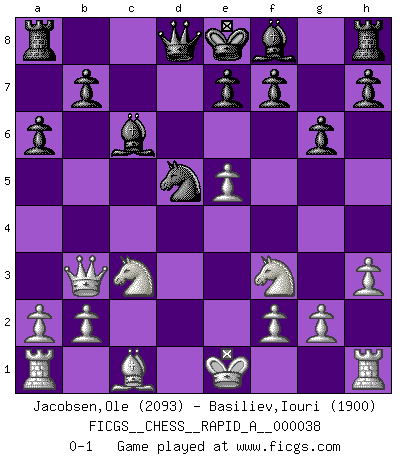 Last move : 0-1 2008 March 28 5:16:33 [Event "FICGS__CHESS__RAPID_A__000038"] [Site "FICGS"] [Date "2008.01.27"] [Round "1"] [White "Jacobsen,Ole"] [Black "Basiliev,Iouri"] [Result "0-1"] [WhiteElo "2093"] [BlackElo "1900"] 1.e4 c5 2.c3 Nf6 3.e5 Nd5 4.d4 cxd4 5.cxd4 d6 6.Nf3 Nc6 7.Bc4 Nb6 8.Bb5 Bd7 9.Nc3 dxe5 10.dxe5 g6 11.h3 a6 12.Bxc6 Bxc6 13.Qb3 Nd5 0-1 This chess game has been lost on time (started : 2008.01.27 18:33:27) Sicilian : Alapin's variation (2.c3) Player Black won this chess game. Follow this game move after move (download)There is only one thing Fischer does in Chess without pleasure: to lose ! (Boris Spassky) Zum Sieg gelangt man nicht, wenn man gut, sondern nur wenn man besser spielt (Savielly Grigorievitsch Tartakower) En partidas rápidas, el Caballo es mas poderoso que el Alfil. (Vlastimil Hort) Le thème de l'attaque double intervient d'une manière ou d'une autre dans l'immense majorité des combinaisons. (Youri Averbakh) Somewhere in the world there is an epigram for every dilemma. (Hendrik Willem van Loon)