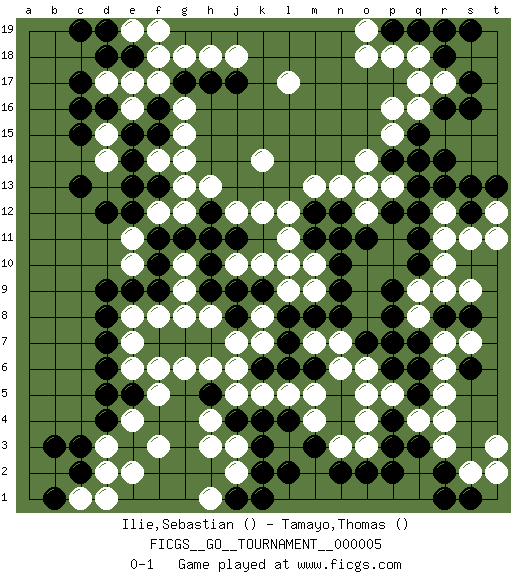 Last move : 0-1 2006 October 12 11:39:16 [Event "FICGS__GO__TOURNAMENT__000005"] [Site "FICGS"] [Date "2006.07.02"] [Round "1"] [Black "Ilie,Sebastian"] [White "Tamayo,Thomas"] [Result "0-1"] 1.r16 e17 2.d4 p16 3.q3 r5 4.c16 d15 5.c15 d14 6.c13 f3 7.d6 l17 8.r8 o4 9.q5 q4 10.p4 r4 11.p3 p5 12.q6 r3 13.r2 s2 14.p2 o5 15.s1 s7 16.s8 r7 17.q7 t3 18.s6 r6 19.m3 r11 20.r13 q8 21.p8 q9 22.o7 m5 23.l4 n7 24.p9 p7 25.p6 o6 26.p7 r9 27.n8 m7 28.m8 d3 29.c3 d2 30.c2 e4 31.d5 r17 32.s17 q17 33.s16 q14 34.q13 p13 35.p12 o13 36.q11 r12 37.q12 j3 38.j4 k7 39.l8 k5 40.k4 h3 41.h5 k8 42.k9 h8 43.j9 g9 44.j8 j7 45.h7 h6 46.g7 g6 47.l7 j5 48.k6 j6 49.l6 l5 50.f7 h4 51.k2 k14 52.e12 g12 53.g11 f12 54.f11 h11 55.h10 e11 56.d12 g10 57.f10 e10 58.f9 f8 59.e9 e8 60.d9 e7 61.d8 e6 62.f13 g15 63.d16 e16 64.f15 g16 65.e15 g13 66.e14 j12 67.j11 k12 68.h12 h13 69.f16 f17 70.e5 f5 71.m12 m13 72.n12 n13 73.d18 l11 74.g17 g18 75.h17 h18 76.j17 j18 77.e18 f18 78.q10 r10 79.s12 s9 80.r18 o3 81.o2 n3 82.n2 m4 83.k3 q18 84.s19 c1 85.b1 d1 86.b3 j2 87.l2 s11 88.s13 d17 89.c17 e19 90.c19 g14 91.q19 p18 92.p19 o19 93.r19 o18 94.q15 p15 95.r14 o12 96.o11 m10 97.n10 l12 98.n11 m9 99.n9 l9 100.m11 l10 101.d19 f19 102.p14 o14 103.j1 h1 104.k1 t12 105.t13 t11 106.d7 f6 107.m6 n6 108.q14 t2 109.r1 h11 110.h9 g8 111.h12 f14 112.e13 h11 113.e3 e2 114.h12 k10 115.h11 q16 116.pass j10 0-1 Comment by player 1 : Sebastian Ilie : thx for scoring , i usually play here from work :) and i didn't have possibility to count :( - congrats ! Comment by player 2 : Thomas Tamayo : W+6.5 Here are the names of the openings (joseki) played in the four corners : Corner q16 : r16 p16 Komoku (Somok, Xiao~mu`) 3-4 Point. The komoku (3-4) point is the traditional corner enclosure move.. Ikken Takagakari (Hankan Nop'dakeolch'im, Yi Gaogua`jiao~, 1-Space High Approach). The 5-4 approach move has become more popular in modern times, as modern Go emphasizes speed and influence. Corner q4 : q3 r5 Komoku (Somok, Xiao~mu`) 3-4 Point. The komoku (3-4) point is the traditional corner enclosure move.. Ikken Kakari (Hankan Keolch'im, Yi Gua`jiao~, 1-Space Low Pincer). The small knight move is the basic approach move to the 3-4 point stone. It has been continually used for over four centuries. There are limitless variations, with new moves constantly being discovered. White 2 opens the door to a treaure store of joseki. Corner d16 : e17 c16 Mokuhazushi (Waemok, Wai`mu`) 5-3 Point. The mokuhazushi (5-3) point was popular in the Edo period in Japan (1600 - 1867). It emphasizes influence; territorially, it is inferior to the 3-4 point. Komoku Kakari. Black 2 is the standard approach because of its solidity and stability. Corner d4 : d4 f3 Hoshi (Hwajeom, Seongjeom, Xingwei`) 4-4 Point. The star or hoshi (4-4) point, emphasizing influence at the potential expense of territory. Ikken Kakari (Hankan Keolch'im, Yi Gua`jiao~, 1-Space Low Approach). White 2 is the standard approach move to the 4-4. Player White won this Go (weiqi, baduk) game. Follow this game move after move (download)The second line is the line of defeat, the third line is the line of territory, and the fourth line is the line of influence. (Anonymous) We need strong personalities and only one world champion to attract sponsors. (Anatoly Karpov)