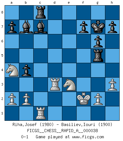 Last move : 0-1 2008 February 9 12:29:38 [Event "FICGS__CHESS__RAPID_A__000038"] [Site "FICGS"] [Date "2008.01.27"] [Round "1"] [White "Riha,Josef"] [Black "Basiliev,Iouri"] [Result "0-1"] [WhiteElo "1980"] [BlackElo "1900"] 1.d4 d5 2.c4 c6 3.Nc3 Nf6 4.Nf3 e6 5.e3 Nbd7 6.Bd3 Bd6 7.Qc2 O-O 8.O-O dxc4 9.Bxc4 b5 10.Be2 Bb7 11.Rd1 Qc7 12.e4 e5 13.dxe5 Nxe5 14.Nd4 Neg4 15.h3 Bh2+ 16.Kf1 Nxf2 17.Kxf2 b4 18.Nf5 g6 19.Nh6+ Kg7 20.Na4 c5 21.Bd3 Rad8 22.Kf1 c4 23.Bg5 Qe5 24.Bxf6+ Qxf6+ 25.Qf2 Qxf2+ 26.Kxf2 cxd3 27.Ng4 Bc7 28.Rac1 Rc8 29.Ne3 Rfe8 30.e5 Rxe5 31.Rxd3 Rg5 0-1 QGD Slav defense Kingside Castling by player Black (move 7) Kingside Castling by player White (move 8) Player Black won this chess game. Follow this game move after move (download)Fischer is completely natural. He plays no roles. He's like a child. Very, very simple. (Zita Rajcsanyi) Computer sind die einzigen Gegner, die nicht immer eine Ausrede auf Lager haben, wenn sie gegen mich verlieren. (Robert James Fischer) El Ajedrez es imaginación. (David Bronstein) Les échecs, c'est l'art d'analyser. (Mikhail Botvinnik) As a goal marker shodan is important. As a destination it is a poor place to stop. (Thomas Tamayo)