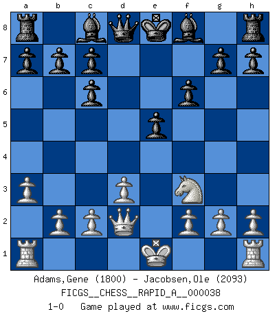 Last move : 1-0 2008 April 4 6:57:30 [Event "FICGS__CHESS__RAPID_A__000038"] [Site "FICGS"] [Date "2008.01.27"] [Round "1"] [White "Adams,Gene"] [Black "Jacobsen,Ole"] [Result "1-0"] [WhiteElo "1800"] [BlackElo "2093"] 1.e4 e5 2.Nf3 Nc6 3.a3 Nf6 4.Bb5 Nxe4 5.d3 Nd6 6.Bxc6 dxc6 7.Nc3 f6 8.Ne4 Nxe4 9.Bd2 Nxd2 10.Qxd2 1-0 This chess game has been lost on time (started : 2008.01.27 18:33:27) King's pawn game Player White won this chess game. Follow this game move after move (download)Chess is as much a mystery as women. (Purdy) Der 70jährige Viktor Kortschnoi: Die Rentenanstalt wollte mich zwingen in Rente zu gehen. Meine Frau erhält jetzt eine Pension- und ich zahle weiter in die Rentenkasse ein! (Viktor Kortschnoi) En un gambito tu regalas un Peón por el bién de tomar un juego perdido. (Samuel Standige Boden) Pour moi, les échecs ne sont pas un jeu mais un art. (Alexandre Alekhine) Wikichess, chess moves explained by 'experimented' players. (Thibault de Vassal)