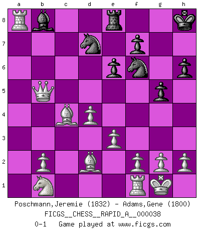 Last move : 0-1 2008 April 14 7:43:39 [Event "FICGS__CHESS__RAPID_A__000038"] [Site "FICGS"] [Date "2008.01.27"] [Round "1"] [White "Poschmann,Jeremie"] [Black "Adams,Gene"] [Result "0-1"] [WhiteElo "1832"] [BlackElo "1800"] 1.d4 d5 2.c4 dxc4 3.e3 b5 4.a4 c6 5.axb5 cxb5 6.Qf3 Bd7 7.Qxa8 e6 8.Bd2 Bc6 9.Qxa7 Bd6 10.Nf3 Nf6 11.Be2 O-O 12.O-O Nbd7 13.Ne5 Bb8 14.Nxc6 Qc8 15.Ne7+ Kh8 16.Nxc8 Rxc8 17.Qb7 Rd8 18.Ra8 h6 19.Qxb5 Re8 20.Bxc4 g5 0-1 This chess game has been lost on time (started : 2008.01.27 18:33:27) Queen's gambit accepted Kingside Castling by player Black (move 11) Kingside Castling by player White (move 12) Player Black won this chess game. Follow this game move after move (download)Combinations have always been the most intriguing aspect of Chess. The masters look for them, the public applauds them, the critics praise them. It is because combinations are possible that Chess is more than a lifeless mathematical exercise. They are the poetry of the game; they are to Chess what melody is to music. They represent the triumph of mind over matter. (Reuben Fine) Man gibt nur Pakete auf. (Paul Keres) Botvinnik trataba de restarle el misterio al Ajedrez, siempre relacionandolo a situaciones de la vida ordinaria. El gustaba de llamar al Ajedrez un típico problema inexacto similar a aquellos de los cuales la gente siempre tiene que enfrentarse en la vida cotidiana. (Garry Kasparov) Les sacrifices démontrent seulement que quelqu'un a gaffé. (Savielly Tartacover) The real voyage of discovery consists not in seeking new lands but in seeing with new eyes. (Marcel Proust)