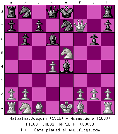 Last move : 1-0 2008 February 18 9:48:49 [Event "FICGS__CHESS__RAPID_A__000038"] [Site "FICGS"] [Date "2008.01.27"] [Round "1"] [White "Malpalma,Joaquim"] [Black "Adams,Gene"] [Result "1-0"] [WhiteElo "1916"] [BlackElo "1800"] 1.d4 d5 2.Nf3 Bg4 3.e3 g6 4.c4 e6 5.Qb3 b6 6.Ne5 Bf5 7.cxd5 Bd6 8.e4 Bxe4 9.dxe6 fxe6 10.Qxe6+ Ne7 11.Qf7+ 1-0 Queen's pawn game Player White won this chess game. Follow this game move after move (download)Why must I lose to this idiot ? (Aron Nimzovich) Es gibt zwei Arten von Opfern: Korrekte und meine. (Mikhail Nekhemyevich Tal) Todos los jugadores de Ajedrez deberían tener un pasatiempo. (Savielly Tartakower) Je ne crois pas en la psychologie, je crois aux bons coups. (Robert Fischer) He who defends everything defends nothing. (Frederick the Great)