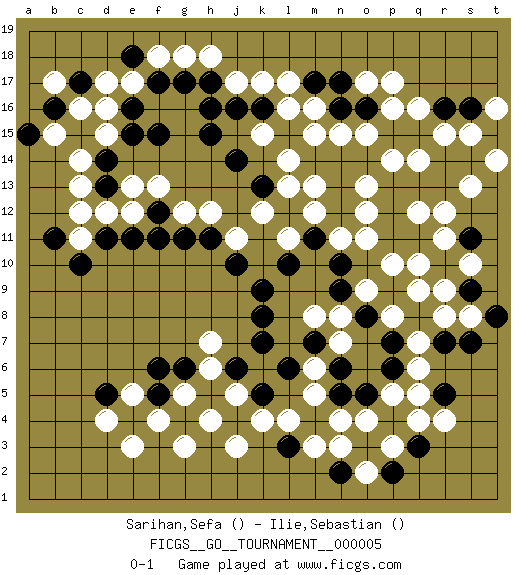 Last move : 0-1 2006 September 22 15:7:13 [Event "FICGS__GO__TOURNAMENT__000005"] [Site "FICGS"] [Date "2006.07.02"] [Round "1"] [Black "Sarihan,Sefa"] [White "Ilie,Sebastian"] [Result "0-1"] 1.f15 p16 2.o16 o17 3.n17 o15 4.n16 p17 5.p15 p14 6.o14 n15 7.n14 m15 8.l15 m16 9.m17 l16 10.m14 l17 11.k16 k17 12.j16 j17 13.h15 l14 14.h16 k15 15.j14 g18 16.g17 f18 17.h17 h18 18.f17 e17 19.e18 d17 20.e16 d16 21.e15 c14 22.d14 c13 23.d13 d12 24.d11 e12 25.f12 f13 26.k13 l13 27.l12 m12 28.n12 l11 29.m11 k12 30.l10 n11 31.n10 o11 32.p11 o12 33.p13 q14 34.q15 o13 35.n13 m13 36.p12 p10 37.p9 q10 38.r10 q9 39.q8 r9 40.q11 r11 41.s11 r12 42.r14 r15 43.r16 s15 44.t15 q16 45.s14 t16 46.s16 t14 47.r13 s13 48.q13 q12 49.s9 r8 50.s7 s8 51.r7 q7 52.t8 s10 53.p6 q6 54.p4 q5 55.r5 q4 56.q3 r4 57.p7 p5 58.o5 o4 59.n5 p3 60.o3 n4 61.m4 n3 62.n2 m3 63.l3 m5 64.l6 l4 65.k5 k4 66.j4 m6 67.k8 o9 68.o8 p8 69.n9 n8 70.k9 j3 71.m7 n7 72.n6 m8 73.k7 h4 74.e11 g12 75.f11 e13 76.g11 h12 77.h11 j11 78.j10 c11 79.c10 d4 80.b11 c12 81.c15 d15 82.g4 g3 83.e4 e3 84.d5 f4 85.f5 e5 86.h5 g5 87.f6 h6 88.j6 h7 89.g6 j5 90.p2 o2 91.c17 c16 92.b16 b15 93.a15 b17 0-1 Here are the names of the openings (joseki) played in the four corners : Corner q16 : p16 o16 Takamoku (Gomok, Gaomu`) 5-4 Point. The takamoku (high) point (5-4). With its emphasis on influence, the 5-4 point complements the 4-4 (hoshi) point in creating an influence-oriented fuseki. Corner q4 : p9 q9 This joseki is unknown. A weak or weird move has probably been played in this corner. Corner d4 : j4 j3 This joseki is unknown. A weak or weird move has probably been played in this corner. Player White won this Go (weiqi, baduk) game. Follow this game move after move (download)In the sound of the stone you can hear its purpose. (Pierre Audouard) It is a good thing for an uneducated man to read books of quotations. (Winston Churchill)