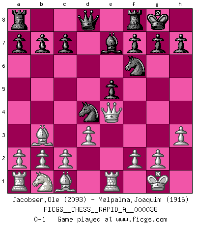 Last move : 0-1 2008 March 12 3:56:35 [Event "FICGS__CHESS__RAPID_A__000038"] [Site "FICGS"] [Date "2008.01.27"] [Round "1"] [White "Jacobsen,Ole"] [Black "Malpalma,Joaquim"] [Result "0-1"] [WhiteElo "2093"] [BlackElo "1916"] 1.e4 e5 2.Nf3 Nc6 3.Bc4 Nf6 4.d3 Be7 5.O-O O-O 6.Bb3 d5 7.exd5 Nxd5 8.Re1 Bg4 9.h3 Bxf3 10.Qxf3 Nd4 11.Qe4 Nf6 0-1 This chess game has been lost on time (started : 2008.01.27 18:33:27) Two knights defense (Modern Bishop's Opening) Kingside Castling by player White (move 5) Kingside Castling by player Black (move 5) Player Black won this chess game. Follow this game move after move (download)The older I grow, the more I value Pawns. (Keres) Es hat in meinem Leben Zeiten gegeben, da ich sehr nahe daran war zu glauben, daß ich auch nicht eine einzige Schachpartie verlieren könnte. (José Raúl Capablanca) Existen dos clases de sacrificios: los correctos y los míos. (Mikhail Tal) A ce moment-là, je menaçais de comprendre la position ! (Clément L'Heureux) Knowledge will give you power, but character respect. (Bruce Lee)