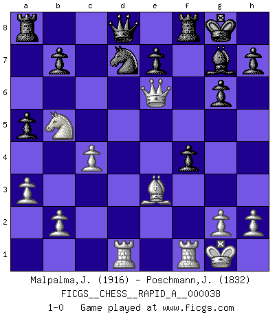 Last move : 1-0 2008 February 10 16:55:47 [Event "FICGS__CHESS__RAPID_A__000038"] [Site "FICGS"] [Date "2008.01.27"] [Round "1"] [White "Malpalma,Joaquim"] [Black "Poschmann,Jeremie"] [Result "1-0"] [WhiteElo "1916"] [BlackElo "1832"] 1.c4 Nf6 2.Nc3 c5 3.Nf3 g6 4.e4 d6 5.d4 cxd4 6.Nxd4 Bg7 7.Be2 O-O 8.O-O Nc6 9.Be3 Bd7 10.Qd2 a5 11.Ndb5 Nb4 12.Rad1 Bc6 13.a3 Na6 14.f3 Nd7 15.f4 Nac5 16.Qc2 f5 17.e5 Bxb5 18.Nxb5 Ne4 19.Bf3 dxe5 20.Bxe4 fxe4 21.Qxe4 exf4 22.Qe6+ 1-0 English Opening Kingside Castling by player Black (move 7) Kingside Castling by player White (move 8) Player White won this chess game. Follow this game move after move (download)Help your pieces so they can help you. (Paul Morphy) Viele Opfer benötigen überhaupt keine konkrete Berechnung. Es genügt sich die entstehende Position kurz vorzustellen, um uns davon zu überzeugen, dass das Opfer korrekt ist. (Mikhail Nekhemyevich Tal) Los finales de Peón son del Ajedrez lo que el cesped es del Golf. (Cecil Purdy) Demandez au pauvre Cg1 ce qu'il en pense. Eduard Gufeld à propos de la variante Saemisch de l'Est-Indienne. I couldn't make any sense out of what this particular thread is about. It sounds like R2 D2 computer speaking. A space fight ?!? Some 'command' problems in Moscow ? Some killers & narcotic addicts attacking some game & a god wannabe ?? (Dinesh De Silva, lost in a russian conflict in FICGS forum)
