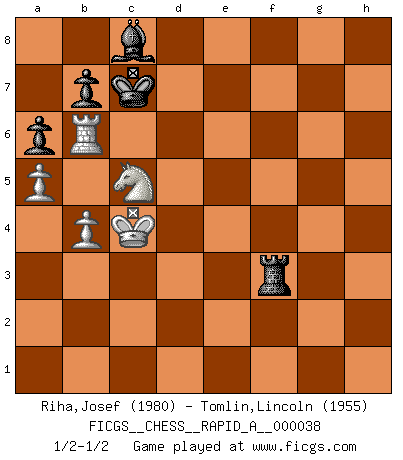 Last move : 1/2-1/2 2008 February 2 18:7:43 [Event "FICGS__CHESS__RAPID_A__000038"] [Site "FICGS"] [Date "2008.01.27"] [Round "1"] [White "Riha,Josef"] [Black "Tomlin,Lincoln"] [Result "1/2-1/2"] [WhiteElo "1980"] [BlackElo "1955"] 1.e4 e6 2.d4 d5 3.Nd2 Nf6 4.e5 Nfd7 5.c3 c5 6.Bd3 Nc6 7.Ne2 cxd4 8.cxd4 f6 9.exf6 Nxf6 10.Nf3 Bd6 11.O-O O-O 12.Bf4 Bxf4 13.Nxf4 Ne4 14.Qc1 Ng5 15.Nxg5 Qxg5 16.Ne2 Qxc1 17.Raxc1 Bd7 18.Bb5 a6 19.Bxc6 Bxc6 20.Rfe1 Rae8 21.f3 Rf6 22.Kf2 Kf7 23.Rc2 e5 24.dxe5 Rxe5 25.Rec1 Re4 26.Kg1 Rb4 27.b3 Ke7 28.Rc3 Kd7 29.a3 Rh4 30.g3 Rh5 31.Nd4 Re5 32.h4 Re8 33.h5 Re5 34.g4 g6 35.hxg6 h5 36.gxh5 Rxh5 37.Kf2 Rxg6 38.a4 Rf6 39.Ke3 Re5+ 40.Kd2 Rh5 41.Rc5 Rh3 42.Ke3 Kd6 43.R5c2 Rg3 44.a5 Rh3 45.b4 Rg3 46.Rh1 Rg5 47.Rch2 Re5+ 48.Kf2 Bd7 49.Rh7 Re8 50.R1h6 Rxh6 51.Rxh6+ Kc7 52.Nb3 Bc8 53.Nc5 Re7 54.Rb6 Rf7 55.Ke3 d4+ 56.Kxd4 Rxf3 57.Kc4 1/2-1/2 French : Tarrasch, Closed variation Kingside Castling by player White (move 11) Kingside Castling by player Black (move 11) 10 pieces endgame at move 56 : White KRNPP , Black KRBPP WHITE : King + 1 Rook 1 Knight 2 Pawns BLACK : King + 1 Rook 1 Bishop 2 Pawns This chess game ended in a draw. Follow this game move after move (download)I'm not afraid of Spassky. The world knows I'm the best. You don't need a match to prove it. (Bobby Fischer) Ich weiss nicht was Gott gegen mich auf 1.e4 antworten würde. (Robert James Fischer) El Ajedrez es despiadado: debes de estar preparado para matar gente. (Nigel Short) Avant la finale, les dieux ont créé le milieu de partie. (Tarrasch) Are you threatening me, Master Jedi ? (Chancellor Palpatine in Star Wars ep.3)