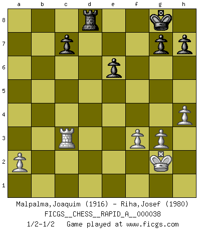 Last move : 1/2-1/2 2008 February 7 15:22:19 [Event "FICGS__CHESS__RAPID_A__000038"] [Site "FICGS"] [Date "2008.01.27"] [Round "1"] [White "Malpalma,Joaquim"] [Black "Riha,Josef"] [Result "1/2-1/2"] [WhiteElo "1916"] [BlackElo "1980"] 1.c4 e5 2.Nc3 Nc6 3.Nf3 Nf6 4.e3 Bb4 5.Qc2 Bxc3 6.bxc3 O-O 7.e4 d6 8.Be2 Nh5 9.d4 exd4 10.cxd4 Qf6 11.O-O Nf4 12.Bxf4 Qxf4 13.Rab1 b6 14.Rfd1 Bg4 15.h3 Bh5 16.c5 dxc5 17.dxc5 Qf6 18.Qa4 bxc5 19.Rdc1 Bxf3 20.Bxf3 Nd4 21.Qa3 Rab8 22.Rxb8 Rxb8 23.Qxa7 Qb6 24.Qa3 Qg6 25.g3 Qc6 26.Kg2 c4 27.e5 Qb5 28.Qe3 Rd8 29.h4 Qa6 30.Be2 Qc6+ 31.f3 Nxe2 32.Qxe2 c3 33.Rc2 Qc5 34.Qe1 Rd3 35.Qe4 Rd8 36.e6 fxe6 37.Qe1 Qc4 38.Qxc3 Qxc3 39.Rxc3 1/2-1/2 English : Four knights, Romanishin variation Kingside Castling by player Black (move 6) Kingside Castling by player White (move 11) This chess game ended in a draw. Follow this game move after move (download)Don't even mention losing to me. I can't stand to think of it. (Bobby Fischer) Es ist peinlich, dass ich nie Weltmeister wurde. Es wäre leicht, Leonid Breschnjew als Ursache vorzuschieben, dessen Apparat den Vorzeigekommunisten Anatoli Karpow in allem unterstützte. Aber Garri Kasparow zum Beispiel, der ebenfalls von den Sowjets unerwünscht war, hat trotz der Widerstände den WM-Titel erobert. (Viktor Kortschnoi) Fischer es el jugador mas fuerte del mundo. De hecho, el jugador mas fuerte que jamas haya existido. (Larry Evans) La tactique est l'élément le plus important du milieu de jeu. (Siegbert Tarrasch) Control your own destiny or someone else will. (Jack Welch)