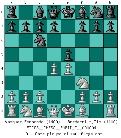 Last move : 1-0 2006 August 12 17:30:22 [Event "FICGS__CHESS__RAPID_C__000004"] [Site "FICGS"] [Date "2006.07.02"] [Round "1"] [White "Vasquez,Fernando"] [Black "Bredernitz,Tim"] [Result "1-0"] [WhiteElo "1400"] [BlackElo "1100"] 1.e4 e5 2.Nf3 Nc6 3.d4 1-0 This chess game has been lost on time (started : 2006.07.02 20:19:42) Scotch Opening Player White won this chess game. Follow this game move after move (download)Chess is everything: art, science and sport. (Anatoly Karpov) Ich glaube nicht an Psychologie, ich glaube an gute Züge. (Robert James Fischer) No existe un remordimiento como el remordimiento del Ajedrez. (H. G. Wells) La menace est plus forte que l'exécution. (Aaron Nimzovitch) In God we trust, all others we virus scan. (Anonymous)
