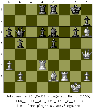 Last move : 1-0 2008 March 28 2:29:13 [Event "FICGS__CHESS__WCH_SEMI_FINAL_2__000003"] [Site "FICGS"] [Date "2008.01.29"] [Round "6"] [White "Balabaev,Farit"] [Black "Ingersol,Harry"] [Result "1-0"] [WhiteElo "2481"] [BlackElo "2555"] 1.e4 c5 2.Nf3 e6 3.d4 cxd4 4.Nxd4 Nc6 5.Nc3 a6 6.Be2 d6 7.Be3 Bd7 8.O-O Nf6 9.f4 Be7 10.Qe1 O-O 11.Qg3 Nxd4 12.Bxd4 Bc6 13.Rad1 b5 14.a3 Qc7 15.Kh1 g6 16.f5 e5 17.Be3 Nxe4 18.Nxe4 Bxe4 19.f6 Bd8 20.Qh4 Qxc2 21.Rd2 Qc6 22.Qh6 Bxg2+ 23.Kg1 Bxf6 24.Rxf6 Rad8 25.Qh4 Bd5 26.Bh6 Rfe8 27.Rf3 f5 28.Rxf5 Qb6+ 29.Rf2 Be6 30.Rd3 1-0 Sicilian : Taimanov variation Kingside Castling by player White (move 8) Kingside Castling by player Black (move 10) Player White won this chess game. Follow this game move after move (download)When the Chess game is over, the Pawn and the King go back to the same box. (Irish saying) Ja, jede Frau in Holland liebt mich bestimmt, und alle Männer hassen mich. (Loek van Wely) Bobby es el jugador de Ajedrez mas fino que este país jamás haya producido. Su memoria para las movidas, su brillantez en soñar combinaciones y su feróz determinación por la victoria son algo extraño. (John Collins) Mais n'est-ce pas déjà le limiter injurieusement que d'appeler les échecs un jeu? N'est-ce pas aussi une science, un art, ou quelque chose qui, comme le cercueil de Mahomet entre ciel et terre, est suspendu entre l'un et l'autre, et qui réunit un nombre incroyable de contraires ? (Stefan Zweig) Political correctness is subjecting us to gross incompetence. (Johann Piek)