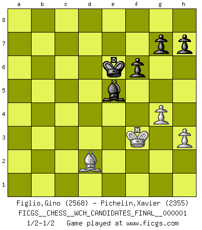 Last move : 1/2-1/2 2008 July 15 0:1:53 [Event "FICGS__CHESS__WCH_CANDIDATES_FINAL__000001"] [Site "FICGS"] [Date "2008.01.29"] [Round "5"] [White "Figlio,Gino"] [Black "Pichelin,Xavier"] [Result "1/2-1/2"] [WhiteElo "2568"] [BlackElo "2355"] 1.Nf3 d5 2.g3 Nf6 3.Bg2 c6 4.O-O Bf5 5.c4 e6 6.cxd5 exd5 7.d3 Be7 8.Nc3 O-O 9.Nd4 Bg6 10.e4 Nbd7 11.Re1 Nc5 12.Nf5 Bxf5 13.exf5 Re8 14.d4 Nce4 15.Bxe4 dxe4 16.Nxe4 Qa5 17.Bf4 Qxf5 18.Nxf6+ Bxf6 19.Qb3 b5 20.Qc3 Qd5 21.Be5 Be7 22.Rac1 Bg5 23.Ra1 Rac8 24.a4 a6 25.Qc5 Bd2 26.Qxd5 cxd5 27.Re2 Bc1 28.axb5 axb5 29.Kf1 f6 30.Bd6 Rxe2 31.Kxe2 Bxb2 32.Ra5 Bxd4 33.Rxb5 Rc2+ 34.Kd3 Rb2 35.Rxd5 Bxf2 36.Ke4 Kf7 37.g4 Ke6 38.Rd3 Rc2 39.Kf3 Be1 40.Bf4 Rc3 41.Rxc3 Bxc3 42.h3 Be5 43.Bd2 1/2-1/2 Reti : King's Indian attack (Barcza system) Kingside Castling by player White (move 4) Kingside Castling by player Black (move 8) 10 pieces endgame at move 41 : White KRBPP , Black KBPPP WHITE : King + 1 Rook 1 Bishop 2 Pawns BLACK : King + 1 Bishop 3 Pawns 9 pieces endgame at move 41 : White KBPP , Black KBPPP WHITE : King + 1 Bishop 2 Pawns BLACK : King + 1 Bishop 3 Pawns This chess game ended in a draw. Follow this game move after move (download)Do you realize Fischer almost never has any bad pieces? He exchanges them, and the bad pieces remain with his opponents. (Yuri Balashov) Das Schach ist nichts für kleine Geister, es beansprucht einen vollen Mann, der sich nicht sklavisch an das Überlieferte hält, sondern selbständig die Tiefen des Spiels zu ergründen sucht. (Wilhelm Steinitz) Yo considero que Fischer es uno de los expertos mas grandes de aperturas de siempre. (Keith Hayward) Celui qui prend des risques peut perdre, celui qui n'en prend pas perd toujours. (Xavier Tartacover) We cannot be sure of having something to live for unless we are willing to die for it. (Ernesto Che Guevara)
