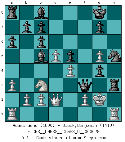 Last move : 0-1 2008 March 19 8:18:8 [Event "FICGS__CHESS__CLASS_D__000078"] [Site "FICGS"] [Date "2008.01.29"] [Round "1"] [White "Adams,Gene"] [Black "Block,Benjamin"] [Result "0-1"] [WhiteElo "1800"] [BlackElo "1419"] 1.e4 e5 2.Nf3 Nc6 3.Bb5 a6 4.Bxc6 dxc6 5.d3 Bd6 6.Nc3 Qe7 7.Be3 Nf6 8.O-O O-O 9.Bg5 h6 10.d4 hxg5 11.d5 g4 12.Ng5 Nh5 13.h4 f6 14.g3 fxg5 15.hxg5 Rf3 16.Qd2 Bc5 17.a3 Rxg3+ 18.Kh2 Rh3+ 19.Kg2 Qf7 20.Rh1 Qf3+ 0-1 Ruy Lopez : Exchange variation Kingside Castling by player White (move 8) Kingside Castling by player Black (move 8) Player Black won this chess game. Follow this game move after move (download)We cannot resist the fascination of sacrifice, since a passion for sacrifices is part of a Chessplayer's nature. (Rudolf Spielman) Je mehr ich von der FIDE weiss, um so weniger verstehe ich. (Alexander Kalifman) Los finales de Peón son del Ajedrez lo que el cesped es del Golf. (Cecil Purdy) Toute estimation doit être constamment réévaluée. (Jacob Estrin) All the troubles of the world come from being unable to sit alone in a quiet room. (Blaise Pascal)