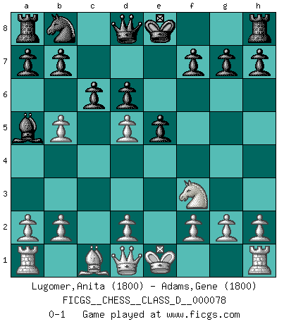 Last move : 0-1 2008 March 21 16:48:40 [Event "FICGS__CHESS__CLASS_D__000078"] [Site "FICGS"] [Date "2008.01.29"] [Round "1"] [White "Lugomer,Anita"] [Black "Adams,Gene"] [Result "0-1"] [WhiteElo "1800"] [BlackElo "1800"] 1.e4 e5 2.Nf3 Nf6 3.Nc3 Bb4 4.Nd5 Nxd5 5.exd5 d6 6.c3 Ba5 7.Bb5+ Bd7 8.c4 Bxb5 9.cxb5 c6 0-1 This chess game has been lost on time (started : 2008.01.29 20:34:15) Petrov Three knights game Player Black won this chess game. Follow this game move after move (download)Without error there can be no brilliancy. (Emanuel Lasker) Ich weiss nicht was Gott gegen mich auf 1.e4 antworten würde. (Robert James Fischer) Puntos débiles o agujeros en la posición de tu oponente deben de ser ocupados por piezas, no Peones. (Siegbert Tarrasch) Si le désir cupide (et stupide) de gagner est une inépuisable source de souffrance, une combinaison brillante sur l'échiquier est une découverte : le coquelicot qui s'épanouit lorsque apparaît la Voie Lactée. (Arrabal) Hold em is to stud what chess is to checkers. (Johnny Moss)