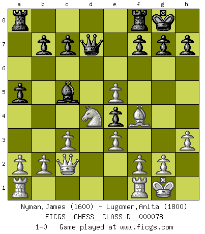 Last move : 1-0 2008 April 25 8:36:28 [Event "FICGS__CHESS__CLASS_D__000078"] [Site "FICGS"] [Date "2008.01.29"] [Round "1"] [White "Nyman,James"] [Black "Lugomer,Anita"] [Result "1-0"] [WhiteElo "1600"] [BlackElo "1800"] 1.d4 d5 2.Nf3 Nf6 3.Bf4 Nc6 4.e3 Bg4 5.Nbd2 e6 6.c3 e5 7.dxe5 Ne4 8.h3 Bf5 9.Bb5 Bc5 10.Nd4 Bd7 11.Bxc6 O-O 12.Bxd7 Qxd7 13.Nxe4 dxe4 14.O-O a5 15.Qc2 1-0 Queen's Bishop game Kingside Castling by player Black (move 11) Kingside Castling by player White (move 14) Player White won this chess game. Follow this game move after move (download)Chess problems demand from the composer the same virtues that characterize all worthwhile art: originality, invention, conciseness, harmony, complexity, and splendid insincerity. (Vladimir Nabokov) Ich habe Putins Aufstieg an die Macht beobachtet und seine Politik, die demokratischen Institutionen meines Landes zu zerstören. (Garry Kasparov) El Peón aislado arroja penumbra sobre todo el tablero. (Aaron Nimzovich) Lorsque vous vous retrouvez devant une position atroce, ne tendez pas un ultime piège dérisoire avec l'intention d'abandonner si l'adversaire le déjoue ! Faites-vous plutôt un devoir de résister comme si votre vie en dépendait. Jouez le coup qui vous déplairait au centuple si vous étiez dans la peau de votre tortionnaire ! Is not life a hundred times too short to bore ourselves ? (Friedrich Nietzsche)