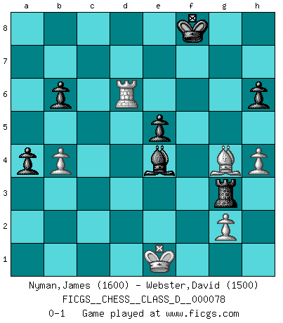 Last move : 0-1 2008 March 13 21:5:48 [Event "FICGS__CHESS__CLASS_D__000078"] [Site "FICGS"] [Date "2008.01.29"] [Round "1"] [White "Nyman,James"] [Black "Webster,David"] [Result "0-1"] [WhiteElo "1600"] [BlackElo "1500"] 1.d4 Nf6 2.Nf3 g6 3.Nc3 d5 4.Bf4 Bg7 5.e3 O-O 6.Be2 Nh5 7.Bg5 h6 8.Bh4 Nc6 9.Ne5 Nxe5 10.dxe5 Bxe5 11.Nxd5 Nf6 12.Nxf6+ exf6 13.c3 g5 14.Bg3 Qxd1+ 15.Rxd1 Be6 16.Bxe5 fxe5 17.b3 a5 18.c4 a4 19.b4 Rfd8 20.a3 Kg7 21.c5 f5 22.h4 g4 23.f3 Rxd1+ 24.Kxd1 Rd8+ 25.Kc2 b6 26.cxb6 cxb6 27.fxg4 fxg4 28.Kc3 Bf5 29.Rd1 Rc8+ 30.Kd2 Rc2+ 31.Ke1 Rc3 32.e4 Bxe4 33.Rd7+ Kf8 34.Bxg4 Rxa3 35.Rd6 Rg3 0-1 King's Indian : East Indian defense Kingside Castling by player Black (move 5) Player Black won this chess game. Follow this game move after move (download)Chess is a cold bath for the mind. (Sir John Simon) Ein Isolani verdüstert die Stimmung auf dem ganzen Schachbrett. (Savielly Grigorievitsch Tartakower) No hay un Gran Maestro de Ajedrez que sea normal; solo se diferencían ellos por la magnitud de su locura. (Viktor Korchnoi) Dans le domaine de la peinture, de la gravure et de la sculpture, dès la première décennie de notre siècle, les artistes abandonnent la représentation de la partie d'échecs pour se concentrer sur les pièces, sur les échiquiers et sur toutes les variations auxquelles les unes et les autres peuvent donner lieu. On passe en quelque sorte d'un thème social à un thème musical (au sens de la musica médiévale, c'est-à-dire d'une notion qui inclue le rythme, l'harmonie, la construction et la déconstruction, etc.). Graphiquement et picturalement, l'échiquier apparaît comme une structure ouverte, dynamique, d'une richesse infinie, autorisant toutes les combinatoires et débouchant sur des mouvements et des rythmes de nature exponentielle. (Michel Pastoureau) There is a computer disease that anybody who works with computers knows about. It's a very serious disease and it interferes completely with the work. The trouble with computers is that you 'play' with them ! (Richard P. Feynman)