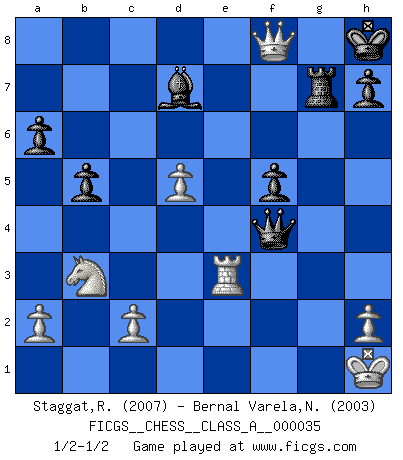 Last move : 1/2-1/2 2008 September 4 0:9:43 [Event "FICGS__CHESS__CLASS_A__000035"] [Site "FICGS"] [Date "2008.01.29"] [Round "1"] [White "Staggat,Rolf"] [Black "Bernal Varela,Nelson"] [Result "1/2-1/2"] [WhiteElo "2007"] [BlackElo "2003"] 1.e4 c5 2.Nf3 d6 3.d4 cxd4 4.Nxd4 Nf6 5.Nc3 a6 6.Bg5 e6 7.f4 Qb6 8.Qd2 Qxb2 9.Nb3 Qa3 10.Bxf6 gxf6 11.Be2 Be7 12.O-O O-O 13.Rf3 Kh8 14.Rh3 Rg8 15.f5 Rg5 16.Rf1 Nd7 17.Rf4 Nf8 18.Bh5 d5 19.Bxf7 exf5 20.exd5 Bd7 21.Re3 Ng6 22.Bxg6 Rxg6 23.Ne2 Bd6 24.Rf1 Rag8 25.g3 Rg4 26.Qc3 R8g6 27.Kh1 b5 28.Nf4 Bxf4 29.Rxf4 Rxf4 30.gxf4 Qd6 31.Qc5 Qxf4 32.Qf8+ Rg8 33.Qxf6+ Rg7 34.Qf8+ 1/2-1/2 Sicilian : Najdorf, 7...Qb6 Kingside Castling by player White (move 12) Kingside Castling by player Black (move 12) This chess game ended in a draw. Follow this game move after move (download)When you are lonely, when you feel yourself an alien in the world, play Chess. This will raise your spirits and be your counselor in war. (Aristotle) Oft bringt ein stiller Zug das Erdbeben. (Richard Reti) Vive, pierde y aprende al observar a tu oponente como gana. (Amber Steenbock) Les Echecs ne sont pas pour les âmes timides. Ils requièrent un homme entier, qui ne s'arrête pas aveuglément à ce qui a été déjà établi, mais qui tente individuellement de sonder les profondeurs du jeu. (W. Steinitz) I believe in luck. How else can you explain the success of those you dislike ? (Jean Cocteau)
