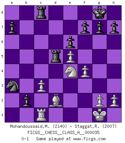 Last move : 0-1 2008 November 7 16:7:29 [Event "FICGS__CHESS__CLASS_A__000035"] [Site "FICGS"] [Date "2008.01.29"] [Round "1"] [White "Mohandoussaid,Malik"] [Black "Staggat,Rolf"] [Result "0-1"] [WhiteElo "2140"] [BlackElo "2007"] 1.d4 Nf6 2.c4 e6 3.Nc3 Bb4 4.f3 d5 5.a3 Bxc3+ 6.bxc3 c5 7.e3 O-O 8.Bd3 dxc4 9.Bxc4 Qc7 10.Ba2 b6 11.Ne2 Ba6 12.O-O Nc6 13.Re1 Rfd8 14.Qa4 Na5 15.Bd2 Qd7 16.Qc2 Rac8 17.Qb2 Nc4 18.Bxc4 Bxc4 19.Rad1 Qa4 20.Ng3 Nd5 21.e4 Nc7 22.dxc5 bxc5 23.Qa1 Bb3 24.Qc1 Bxd1 25.Rxd1 c4 26.Re1 Nb5 27.e5 Qxa3 28.Qc2 Rd5 29.f4 Qb3 30.Rc1 Na3 31.Qxb3 cxb3 32.Ne4 b2 0-1 Nimzo-Indian : Kmoch variation Kingside Castling by player Black (move 7) Kingside Castling by player White (move 12) Player Black won this chess game. Follow this game move after move (download)My style is somewhere between that of Tal and Petrosian. (Reshevsky) Schach ist die gewalttätigste aller Sportarten. (Garry Kasparov) El Ajedrez es un expediente tonto que hace creer a la gente inactiva que hacen una cosa muy astuta cuando solamente estan perdiendo su tiempo. (George Bernard Shaw) La victoire dans une partie d'Echecs appartient la plupart du temps à celui qui voit un peu plus loin que l'adversaire. (Lasker) You lose, general Kenobi. (General Grievous in Star Wars ep.3)
