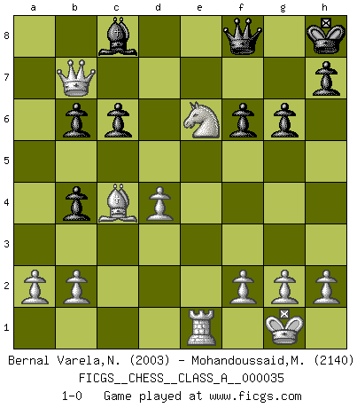 Last move : 1-0 2008 June 1 21:13:41 [Event "FICGS__CHESS__CLASS_A__000035"] [Site "FICGS"] [Date "2008.01.29"] [Round "1"] [White "Bernal Varela,Nelson"] [Black "Mohandoussaid,Malik"] [Result "1-0"] [WhiteElo "2003"] [BlackElo "2140"] 1.e4 e5 2.Nf3 Nf6 3.Nxe5 d6 4.Nf3 Nxe4 5.d4 d5 6.Bd3 Bd6 7.O-O O-O 8.c4 c6 9.Re1 Re8 10.Qb3 b6 11.Nc3 Nxc3 12.Rxe8+ Qxe8 13.Qxc3 dxc4 14.Bxc4 a5 15.Ng5 Ra7 16.Bd2 Bb4 17.Qc2 g6 18.Re1 Qf8 19.Bxb4 axb4 20.Qe4 Kg7 21.Qe5+ f6 22.Qxb8 Rb7 23.Ne6+ Kh8 24.Qxb7 1-0 Petrov : Classical attack, Marshall variation Kingside Castling by player White (move 7) Kingside Castling by player Black (move 7) Player White won this chess game. Follow this game move after move (download)I like to say that Bobby Fischer was the greatest player ever. But what made Fischer a genius was his ability to blend an American freshness and pragmatism with Russian ideas about strategy. (Bruce Pandolfini) Jeder leidlich begabte Spieler, er braucht keineswegs hervorragend veranlagt zu sein, kann es zum Meister bringen. Aber das ist ja auch gar nicht nötig! Der richtige Standpunkt ist es, zu seinem Vergnügen zu spielen, und man glaube ja nicht, dass der Genuss proportional dem Können sei. (Siegbert Tarrasch) ¿Que sería del Ajedrez sin errores graciosos?. (Kurt Richter) Vous m'avez demandé de vous exposer quel est le fondement de la prière. Je ne fais que préparer les pièces du jeu sur la table... Nous sera-t-il permis d'en adopter les règles et si nous les appliquons scrupuleusement nous ne tarderons pas à faire mat le Roi divin ! Il ne pourra échapper à nos mains. (Sainte Thérèse d'Avila, Chemin de perfection) Always remember that you are unique; just like everyone else. (Unknown)