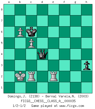 Last move : 1/2-1/2 2009 February 26 16:54:46 [Event "FICGS__CHESS__CLASS_A__000035"] [Site "FICGS"] [Date "2008.01.29"] [Round "1"] [White "Domingo,Jordi"] [Black "Bernal Varela,Nelson"] [Result "1/2-1/2"] [WhiteElo "2138"] [BlackElo "2003"] 1.e4 c5 2.Nf3 d6 3.d4 cxd4 4.Nxd4 Nf6 5.Nc3 a6 6.Be3 Ng4 7.Bg5 h6 8.Bh4 g5 9.Bg3 Bg7 10.h3 Ne5 11.f3 Nbc6 12.Bf2 Ng6 13.Qd2 Qa5 14.O-O-O Bd7 15.Kb1 Nxd4 16.Bxd4 Bxd4 17.Qxd4 Qc5 18.Qd2 O-O-O 19.Nd5 Kb8 20.g3 e6 21.Nb4 Bb5 22.f4 gxf4 23.Bxb5 Qxb5 24.gxf4 f5 25.a4 Qc5 26.Rhe1 e5 27.Nd3 Qc8 28.exf5 Qxf5 29.fxe5 Nxe5 30.Nxe5 dxe5 31.Qxd8+ Rxd8 32.Rxd8+ Ka7 33.Rd3 h5 34.Rde3 h4 35.b3 e4 36.Rxe4 Qxh3 37.R4e3 Qg2 38.R3e2 Qh3 39.Rg1 a5 40.Kb2 Qf5 41.Rh1 Qf6+ 42.Ka2 b5 43.axb5 a4 44.Rh3 axb3+ 45.Rxb3 Qf7 46.Re4 Qf5 47.b6+ Kb7 48.Re7+ Kb8 49.Re2 Kb7 50.c4 h3 51.Rc3 Qa5+ 52.Kb3 Qf5 53.c5 Kc6 54.Ka3 Qf1 55.R3c2 Qf3+ 56.Kb4 Qf4+ 57.Rc4 Qf5 58.Ka4 Qb1 59.R4c2 Qb5+ 60.Ka3 Qa5+ 61.Kb3 Qb5+ 62.Kc3 Qa4 63.Kb2 Qd4+ 64.Kb3 Qd3+ 65.Kb2 Qd4+ 66.Kb3 Qd3+ 67.Kb2 Qd4+ 1/2-1/2 Sicilian : Najdorf, Byrne (English) attack Queenside Castling by player White (move 14) Queenside Castling by player Black (move 18) 10 pieces endgame at move 43 : White KRRPPP , Black KQPP WHITE : King + 2 Rooks 3 Pawns BLACK : King + 1 Queen 2 Pawns 9 pieces endgame at move 44 : White KRRPP , Black KQPP WHITE : King + 2 Rooks 2 Pawns BLACK : King + 1 Queen 2 Pawns 8 pieces endgame at move 45 : White KRRPP , Black KQP WHITE : King + 2 Rooks 2 Pawns BLACK : King + 1 Queen 1 Pawn This chess game ended in a draw. Follow this game move after move (download)In a gambit you give up a Pawn for the sake of getting a lost game. (Samuel Standige Boden) Ich trinke, ich rauche, ich spiele, ich liebe Frauen aber Fernschach ist ein Laster, das ich nicht habe. (Mikhail Nekhemyevich Tal) Para mi, el Ajedrez es la vida y cada partida es como una nueva vida. Todo jugador de Ajedrez suele vivir muchas vidas durante su vida. (Eduard Gufeld) Des points faibles ou des trous dans la position de l'adversaire doivent être occupés par des pièces et non pas par des pions. (Siegbert Tarrasch) The difference between stupidity and genius is that genius has its limits. (Murphy)