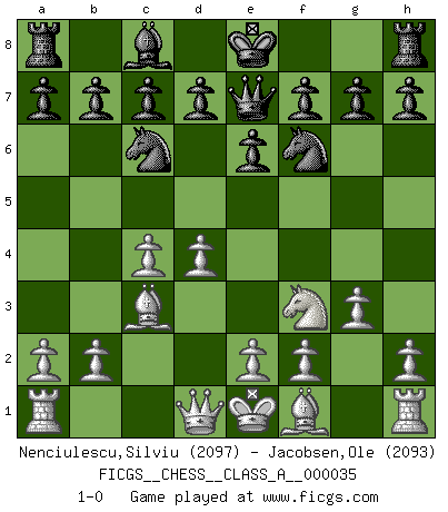 Last move : 1-0 2008 April 1 18:48:9 [Event "FICGS__CHESS__CLASS_A__000035"] [Site "FICGS"] [Date "2008.01.29"] [Round "1"] [White "Nenciulescu,Silviu"] [Black "Jacobsen,Ole"] [Result "1-0"] [WhiteElo "2097"] [BlackElo "2093"] 1.d4 Nf6 2.c4 e6 3.Nf3 Bb4+ 4.Bd2 Qe7 5.g3 Nc6 6.Nc3 Bxc3 7.Bxc3 1-0 This chess game has been lost on time (started : 2008.01.29 20:44:31) Bogo-Indian defense, Nimzovich variation Player White won this chess game. Follow this game move after move (download)Only the player with the initiative has the right to attack. (Wilhelm Steinitz) Mit sehr nachdenklichem Gesicht schreitet Bobby durch den Turniersaal. Was ist passiert?, fragt Lombardy. Ich stehe schlecht, antwortet Fischer. Lombardy: Dann biete doch einfach Remis an. Fischer: So schlecht stehe ich nun auch wieder nicht! (Robert James Fischer) Me dio la sensación de como si yo estuviera jugando en contra del mismo Ajedrez. - al estar jugando en contra de Robert Fischer (Walter Shipman) Même un GMI sait rarement calculer sur plus de cinq coups une attaque à sacrifices. (Rudolf Spielmann) Luck is what you have left over after you give 100 percent. (Langston Coleman)