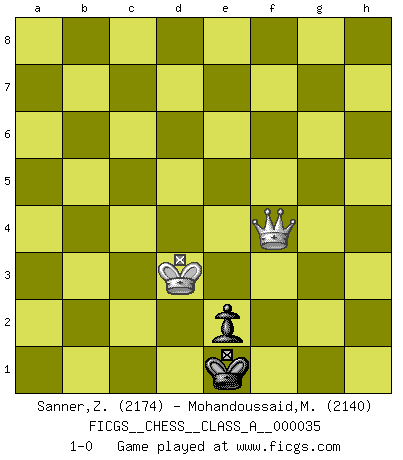 Last move : 1-0 2009 February 4 19:12:24 [Event "FICGS__CHESS__CLASS_A__000035"] [Site "FICGS"] [Date "2008.01.29"] [Round "1"] [White "Sanner,Zdzislaw"] [Black "Mohandoussaid,Malik"] [Result "1-0"] [WhiteElo "2174"] [BlackElo "2140"] 1.d4 Nf6 2.Nf3 e6 3.e3 Be7 4.Bd3 O-O 5.O-O d5 6.Nbd2 Nbd7 7.e4 dxe4 8.Nxe4 Nxe4 9.Bxe4 Nf6 10.Bd3 b6 11.c3 Bb7 12.Re1 c5 13.Bf4 Rc8 14.Be5 Re8 15.Qe2 Bf8 16.dxc5 bxc5 17.Bb5 Bc6 18.Bxc6 Rxc6 19.Rad1 Qb6 20.Bxf6 gxf6 21.b3 Rd8 22.Nd2 R6c8 23.Nc4 Qc7 24.Qe4 Bg7 25.Qf3 f5 26.g3 Qb8 27.Re3 Rxd1+ 28.Qxd1 Rd8 29.Rd3 Rxd3 30.Qxd3 f4 31.Qf3 fxg3 32.hxg3 Qd8 33.Kf1 h5 34.Qxh5 Qd3+ 35.Kg2 Qe4+ 36.Qf3 Qxf3+ 37.Kxf3 Bxc3 38.g4 Kg7 39.Ke4 Kf6 40.Nd6 a6 41.Kd3 Bd4 42.f3 Kg6 43.Kc4 Be3 44.Ne4 f5 45.gxf5+ Kxf5 46.Nxc5 a5 47.a4 Bd2 48.Nd3 e5 49.Kd5 Bc3 50.b4 axb4 51.a5 b3 52.a6 Bd4 53.f4 b2 54.Nxb2 Kxf4 55.Nd3+ Ke3 56.Nc5 Bxc5 57.Kxc5 Kd3 58.a7 e4 59.a8Q e3 60.Qd5+ Ke2 61.Kd4 Kf2 62.Qf5+ Ke2 63.Kc3 Ke1 64.Kd3 e2 65.Qf4 1-0 Queen's pawn : Yusupov-Rubinstein system Kingside Castling by player Black (move 4) Kingside Castling by player White (move 5) 10 pieces endgame at move 45 : White KNPPP , Black KBPPP WHITE : King + 1 Knight 3 Pawns BLACK : King + 1 Bishop 3 Pawns 9 pieces endgame at move 46 : White KNPPP , Black KBPP WHITE : King + 1 Knight 3 Pawns BLACK : King + 1 Bishop 2 Pawns 8 pieces endgame at move 50 : White KNPP , Black KBPP WHITE : King + 1 Knight 2 Pawns BLACK : King + 1 Bishop 2 Pawns 7 pieces endgame at move 54 : White KNPP , Black KBP WHITE : King + 1 Knight 2 Pawns BLACK : King + 1 Bishop 1 Pawn 6 pieces endgame at move 54 : White KNP , Black KBP WHITE : King + 1 Knight 1 Pawn BLACK : King + 1 Bishop 1 Pawn 5 pieces endgame at move 56 : White KP , Black KBP WHITE : King + 1 Pawn BLACK : King + 1 Bishop 1 Pawn 4 pieces endgame at move 57 : White KP , Black KP WHITE : King + 1 Pawn BLACK : King + 1 Pawn Promotion Queen by player White (move 59) Player White won this chess game. Follow this game move after move (download)There's never before been a Chess player with such a thorough knowledge of the intricacies of the game and such an absolutely indomitable will to win. I think Bobby is the greatest player that ever lived. (Lisa Lane) Herr Iljumschinow ist ein etwas merkwürdiger Geschäftsmann: Er arbeitet zusammen mit Leuten wie Muammar al-Gaddafi; früher ist das Saddam Hussein gewesen. (Joel Lautier) Vive, pierde y aprende al observar a tu oponente como gana. (Amber Steenbock) Un footballeur joue avec ses pieds, parfois avec sa tête. Un joueur d'échecs ne joue qu'avec sa tête. Et quand il ne joue plus, il meurt. (Jacob Murray) You have to believe in yourself. (Sun Tzu)