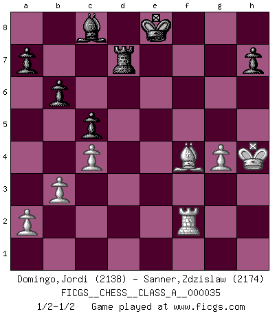 Last move : 1/2-1/2 2008 April 26 11:30:39 [Event "FICGS__CHESS__CLASS_A__000035"] [Site "FICGS"] [Date "2008.01.29"] [Round "1"] [White "Domingo,Jordi"] [Black "Sanner,Zdzislaw"] [Result "1/2-1/2"] [WhiteElo "2138"] [BlackElo "2174"] 1.e4 e5 2.Nf3 Nc6 3.Bc4 Nf6 4.Ng5 Bc5 5.Nxf7 Bxf2+ 6.Kxf2 Nxe4+ 7.Ke3 Qh4 8.g3 Nxg3 9.hxg3 Qd4+ 10.Kf3 d5 11.Rh4 e4+ 12.Kg2 O-O 13.Nc3 dxc4 14.Qh5 Ne7 15.Rxe4 Qf6 16.Rf4 Qc6+ 17.Rf3 Qe8 18.Nh6+ gxh6 19.Rxf8+ Qxf8 20.d3 b6 21.Bxh6 Bb7+ 22.Kg1 Qf5 23.Qg5+ Qxg5 24.Bxg5 Nd5 25.Nxd5 Bxd5 26.dxc4 Bxc4 27.Re1 Rf8 28.b3 Bd5 29.c4 Bb7 30.Bh6 Rf6 31.Bf4 Rf7 32.Kf2 Rd7 33.g4 Kf7 34.Kg3 c5 35.Kh4 Bc8 36.Rf1 Ke8 37.Rf2 1/2-1/2 Two knights defense : Wilkes Barre (Traxler) variation Kingside Castling by player Black (move 12) This chess game ended in a draw. Follow this game move after move (download)It is not enough to be a good player... you must also play well. (Siegbert Tarrasch) Der Umstand, daß uns eine 7 Stunden Zeitkontrolle ermöglicht eine großartige, tiefe Partie zu spielen, ist für die Massenmedien nicht weiter von Bedeutung. (Alexej Shirov) Cuando tengo las piezas blancas, yo gano porque soy blanco; Cuando tengo las piezas negras, yo gano porque soy Bogolyubov. (Bogolyubov) Il vaut toujours mieux jouer un plan faux de façon logique que de n'avoir pas de plan du tout. (Victor Kortchnoï) An expert is a man who has made all the mistakes which can be made in a very narrow field. (Niels Bohr)