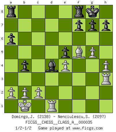 Last move : 1/2-1/2 2008 April 20 6:37:4 [Event "FICGS__CHESS__CLASS_A__000035"] [Site "FICGS"] [Date "2008.01.29"] [Round "1"] [White "Domingo,Jordi"] [Black "Nenciulescu,Silviu"] [Result "1/2-1/2"] [WhiteElo "2138"] [BlackElo "2097"] 1.e4 c5 2.Nf3 d6 3.d4 cxd4 4.Nxd4 Nf6 5.Nc3 a6 6.Be3 Nc6 7.f3 e6 8.Qd2 Be7 9.O-O-O O-O 10.g4 Nxd4 11.Qxd4 b5 12.g5 Nd7 13.h4 Qa5 14.Kb1 Ne5 15.f4 Ng4 16.Bh3 Nxe3 17.Qxe3 b4 18.Ne2 Qc5 19.Nd4 e5 20.fxe5 dxe5 21.Nf5 Bxf5 22.Qxc5 Bxc5 23.Bxf5 Bd4 24.Rh3 1/2-1/2 Sicilian : Najdorf, Byrne (English) attack Queenside Castling by player White (move 9) Kingside Castling by player Black (move 9) This chess game ended in a draw. Follow this game move after move (download)It is difficult to play against Einstein's theory --on his first loss to Fischer. (Mikhail Tal) Der Schachmeister von Heute braucht Courage, einen Killerinstinkt, Ausdauer und Arroganz. (Larry Evans) Muchos jugadores de Ajedrez se sorprendían cuando después de la partida, Fischer explicaba con calma: 'Yo ya había analizado esta posibilidad' en una posición en la cual yo creía que no era posible de prever desde la apertura. (Mikhail Tal) Les Echecs ne sont pas pour les âmes timides. Ils requièrent un homme entier, qui ne s'arrête pas aveuglément à ce qui a été déjà établi, mais qui tente individuellement de sonder les profondeurs du jeu. (W. Steinitz) Horse racing is animated roulette. (Roger Kahn)