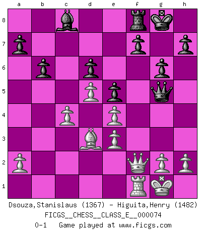 Last move : 0-1 2008 July 13 2:53:55 [Event "FICGS__CHESS__CLASS_E__000074"] [Site "FICGS"] [Date "2008.01.30"] [Round "1"] [White "Dsouza,Stanislaus"] [Black "Higuita,Henry"] [Result "0-1"] [WhiteElo "1367"] [BlackElo "1482"] 1.d4 g6 2.e4 Bg7 3.c3 b6 4.d5 Bb7 5.Be2 d6 6.Nf3 Nf6 7.Bd3 O-O 8.Be3 c6 9.c4 cxd5 10.cxd5 Ng4 11.Qd2 Nxe3 12.fxe3 Nd7 13.Nc3 Ne5 14.Nxe5 Bxe5 15.O-O Rc8 16.Rac1 Bxc3 17.Rxc3 Rxc3 18.bxc3 Bc8 19.c4 e5 20.Qf2 Qg5 0-1 This chess game has been lost on time (started : 2008.01.30 1:57:18) Modern defense Kingside Castling by player Black (move 7) Kingside Castling by player White (move 15) Player Black won this chess game. Follow this game move after move (download)You can only get good at Chess if you love the game. (Bobby Fischer) Man braucht nicht immer den besten Zug zu spielen: Ein Zug muß aktiv, unternehmungslustig, korrekt und schön sein. (David Bronstein) ¿Esta Bobby Fischer algo cuerdo?. (Salo Flohr) Comme les marins qui ont mille raisons différentes d'aller en mer, les joueurs d'échecs en ont tout autant avant de s'installer devant une table et jouer... (Vincent Bertignac, philosophe) The only thing that matters is the evidence. (Horatio Caine, C.S.I. Miami)