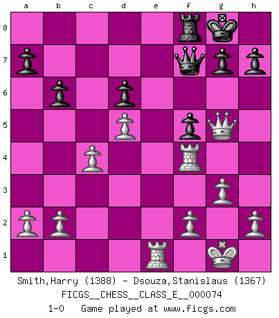 Last move : 1-0 2008 July 23 3:57:46 [Event "FICGS__CHESS__CLASS_E__000074"] [Site "FICGS"] [Date "2008.01.30"] [Round "1"] [White "Smith,Harry"] [Black "Dsouza,Stanislaus"] [Result "1-0"] [WhiteElo "1388"] [BlackElo "1367"] 1.e4 e5 2.Nf3 d6 3.g3 Be7 4.Bg2 Bg4 5.O-O Nf6 6.d3 Nc6 7.Nc3 Nd4 8.Be3 Nxf3+ 9.Bxf3 O-O 10.Bxg4 Nxg4 11.Qxg4 Bf6 12.Nd5 c6 13.c3 cxd5 14.exd5 b6 15.d4 Rc8 16.Rad1 exd4 17.Bxd4 Bxd4 18.Rxd4 f5 19.Qh4 Qe8 20.Qg5 Rc7 21.Rh4 Re7 22.c4 Re1 23.Rf4 Qf7 24.Rxe1 1-0 This chess game has been lost on time (started : 2008.01.30 1:57:18) Philidor's defense Kingside Castling by player White (move 5) Kingside Castling by player Black (move 9) Player White won this chess game. Follow this game move after move (download)There just isn't enough televised Chess. (David Letterman) Wenn Du absolut nicht mehr weißt, was Du tun sollst, dann ist es Zeit für Panik. (John van der Wiel) El Ajedrez no es como la vida... ¡tiene reglas!. (Mark Pasternak) Des combinaisons [dans le jeu d'échecs] pareilles à des mélodies. Je crois entendre pour ainsi dire la musique des coups... (Vladimir Nabokov) It's not enough to succeed. Others must fail. (Gore Vidal)