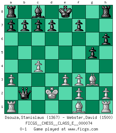 Last move : 0-1 2008 March 3 14:31:20 [Event "FICGS__CHESS__CLASS_E__000074"] [Site "FICGS"] [Date "2008.01.30"] [Round "1"] [White "Dsouza,Stanislaus"] [Black "Webster,David"] [Result "0-1"] [WhiteElo "1367"] [BlackElo "1500"] 1.c4 e5 2.d4 exd4 3.Qxd4 Nc6 4.Qd1 Nf6 5.Bg5 h6 6.Bh4 Bb4+ 7.Nd2 g5 8.Bg3 Ne4 9.Ngf3 Nd4 10.a3 Nxf3+ 11.gxf3 Bxd2+ 12.Qxd2 Nxd2 13.Kxd2 Qf6 14.e3 Qxb2+ 0-1 English Opening Player Black won this chess game. Follow this game move after move (download)Let the perfectionist play postal. (Yasser Seirawan) Man wirke der falschen Auffassung entgegen, als ob jeder Zug Unmittelbares zu leisten habe; auch Werte- und Ruhezüge haben ihre Existenzberechtigung. (Aaron Nimzowitsch) El Ajedrez es sobre todo, ¡una pelea!. (Emanuel Lasker) Roi des jeux et jeu des rois, les échecs portent en eux un sentiment d'infini. Ils donnent à celui qui s'est efforcé d'en approfondir les arcanes l'impression de n'être pas à la mesure de l'homme; en fait, ils constituent un résumé de l'univers, un microcosme, et figurent cette grande échelle qui, dans les plans de la lumière descend jusqu'à la matière, qui des abîmes insondables remonte jusqu'en l'infini de Dieu. (Pyrame) It is a good thing for an uneducated man to read books of quotations. (Winston Churchill)